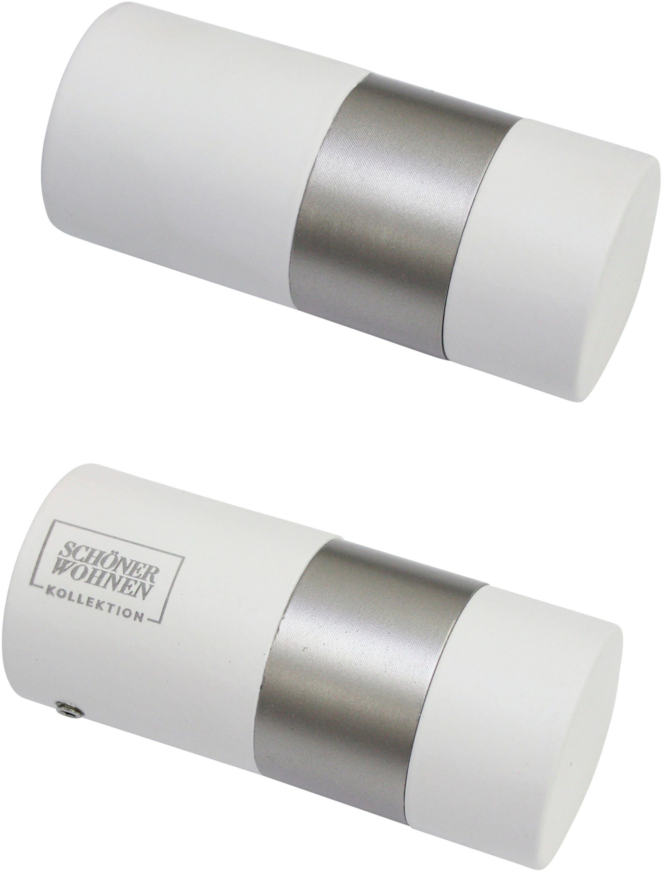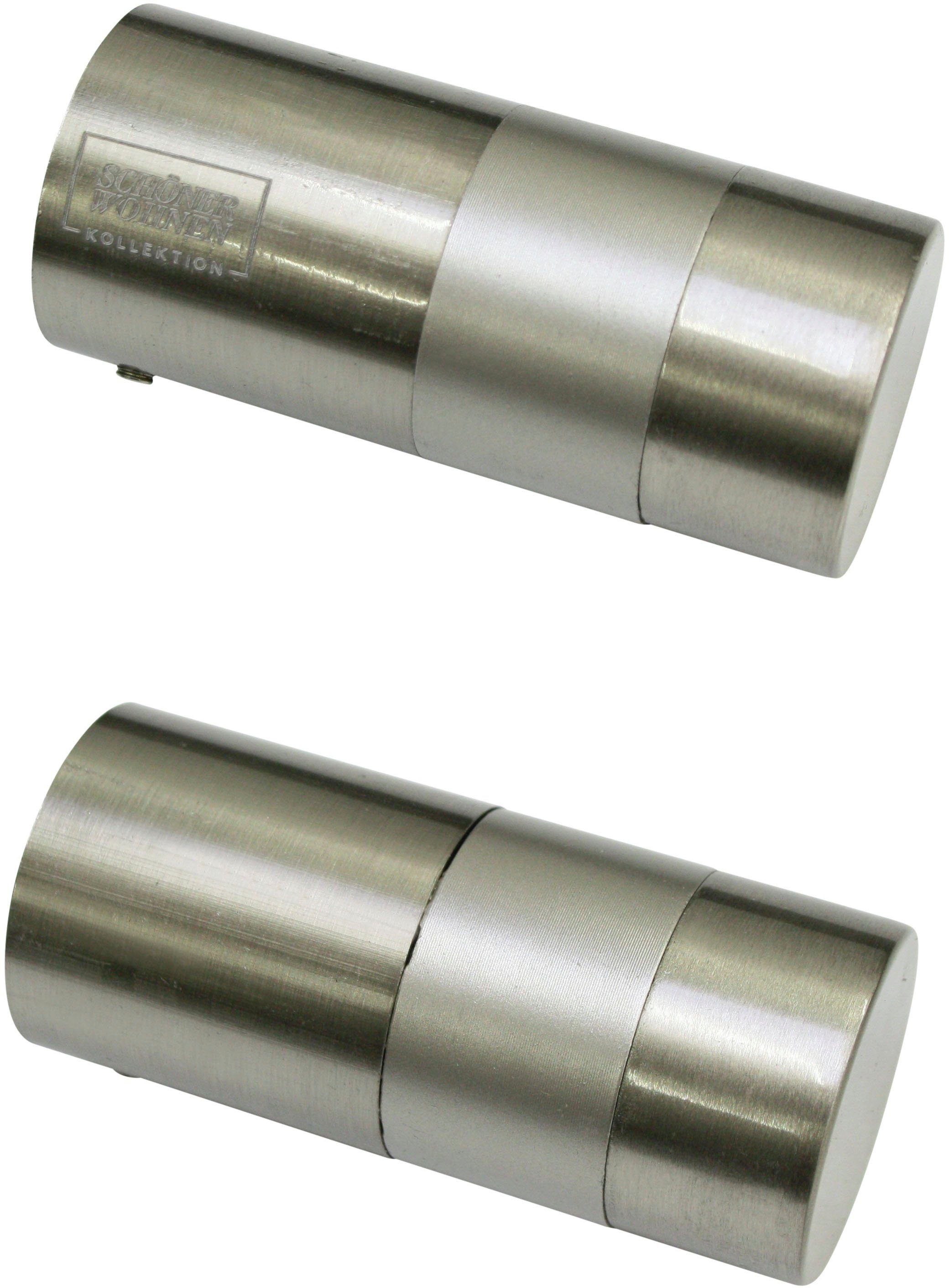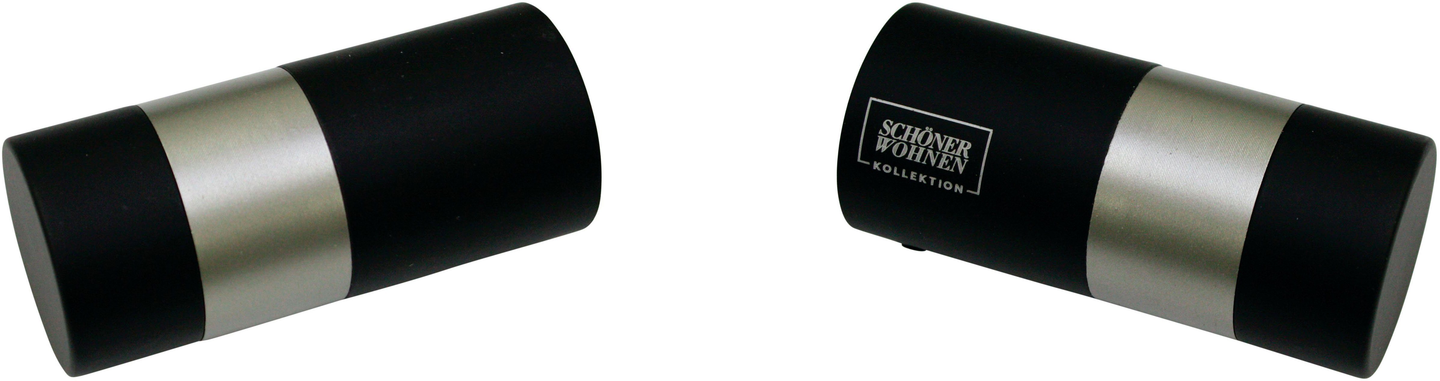 Beschreibung | Das Endstück Zylinder aus Metall in edelstahl-optik, mit einem Kontrastring in silber-matt, bildet den perfekten Abschluss für die Ø 20 mm Gardinenstange Leon. Die hochwertige Optik wird durch eine „SCHÖNER WOHNEN Kollektion“ Lasergravur auf dem rechten Endstück vervollständigt und schafft es so, ihre Gardinen beim perfekten Auftritt am Fenster gekonnt zu unterstützen. Wer das Branding nicht prominent sichtbar haben möchte, hat die Möglichkeit dieses in Richtung Wand zu drehen und es so verschwinden zu lassen. |