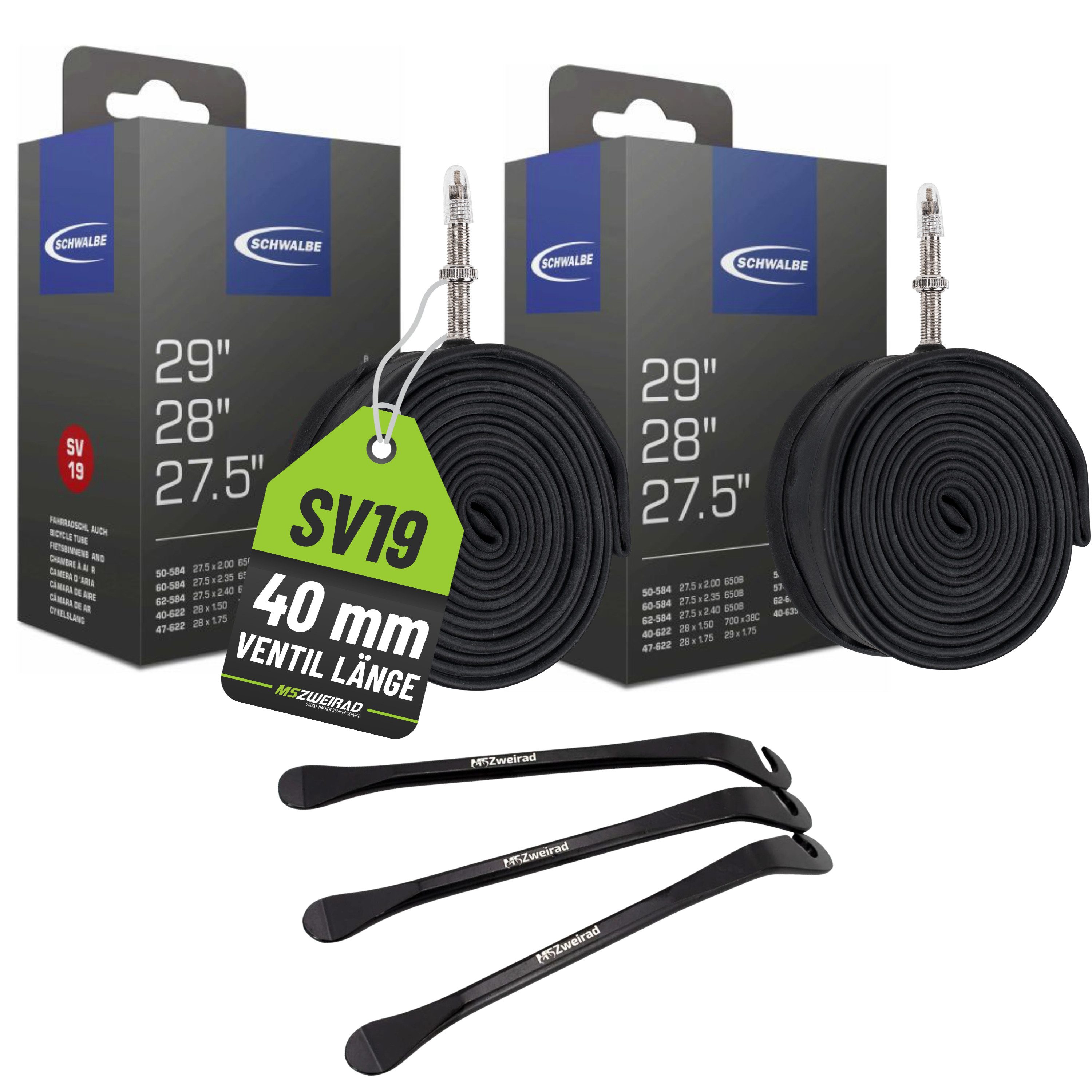 Suchen Sie nach einem zuverlässigen und langlebigen Fahrradschlauch? Hier bieten wir Ihnen die Schwalbe Schläuche an. Dieses Set ist perfekt für diejenigen, die einen Satz von 3 Schläuchen brauchen mit einem ETRTO Maß von 40/62-584/635 und einem SV Ventil in 40mm Довжина. Zu dem Schlauchset erhalten Sie zusätzlich unsere stabilen MSZweirad Reifenheber für eine einfache Demontage der alten Räder.