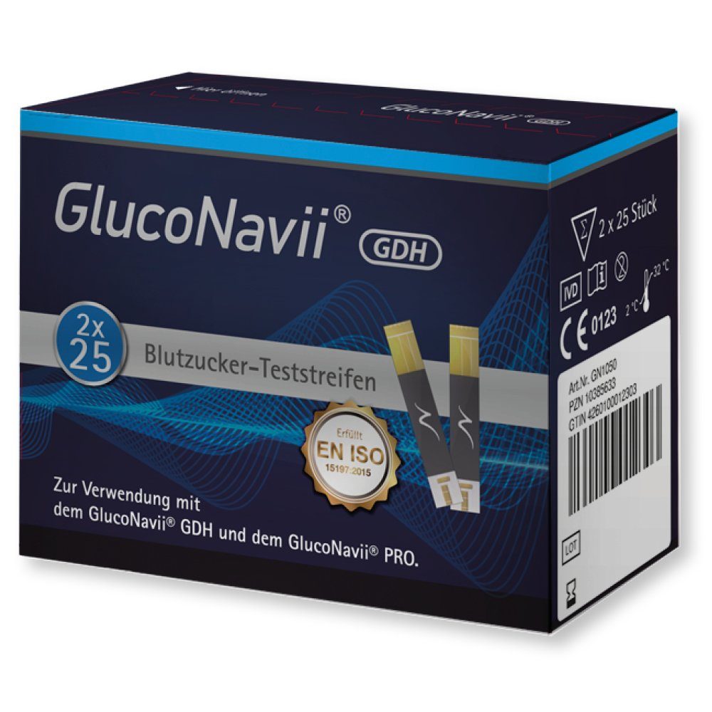 GlucoNavii Pro Glukose-Teststreifen 50 Stück (2 x 25 Stück) zur Blutzuckerselbstsbestimmung mit dem GlucoNavii Pro Blutzucker-Messgerät. Die Teststeifen verfügen über eine innovative Teststreifentechnologie mit einer echt Goldelektroden. Durch eine verbesserte Enzymzusammensetzung (GDH-FAD) verfügen die GlucoNavii Blutzucker Teststeifen über eine noch genauere Messgenauigkeit. Für eine exakte Messung ist nur eine sehr geringe Probenmenge von 0,5 µl nötig. Die GlucoNavii® PRO Blutzucker Teststreifen steht für Labor geprüfte Qualität zu einem günstigen Preis.