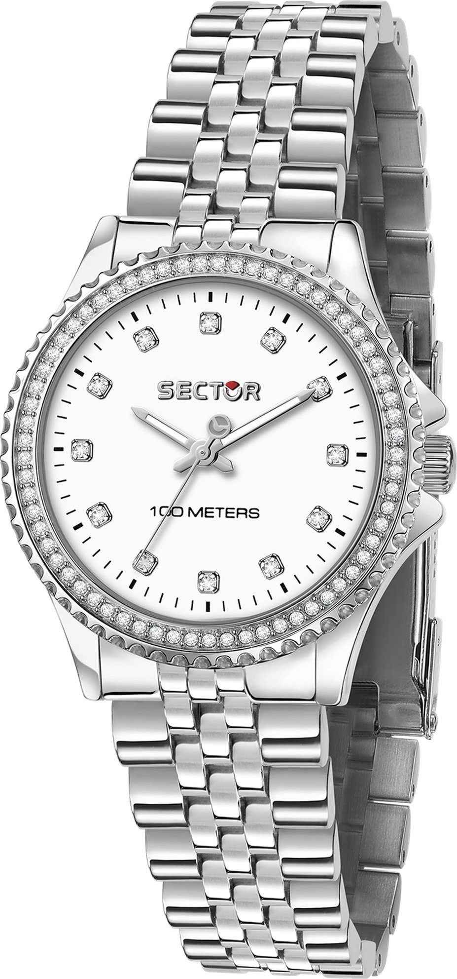 Die Fashion Uhr der Marke Sector hat ein schönes Armband aus Edelstahl in silber mit Sicherheits-Faltschließe. Eine Uhr aus der Sector Numbers Kollektion für Damen in der Gehäusefarbe silber mit Quarzwerk. Die Analoguhr mit Mineralglas hat ein Zifferblatt in der Farbe weiß. Die Form der Uhr ist rund und das Gehäuse ist mittel ca. 35mm.