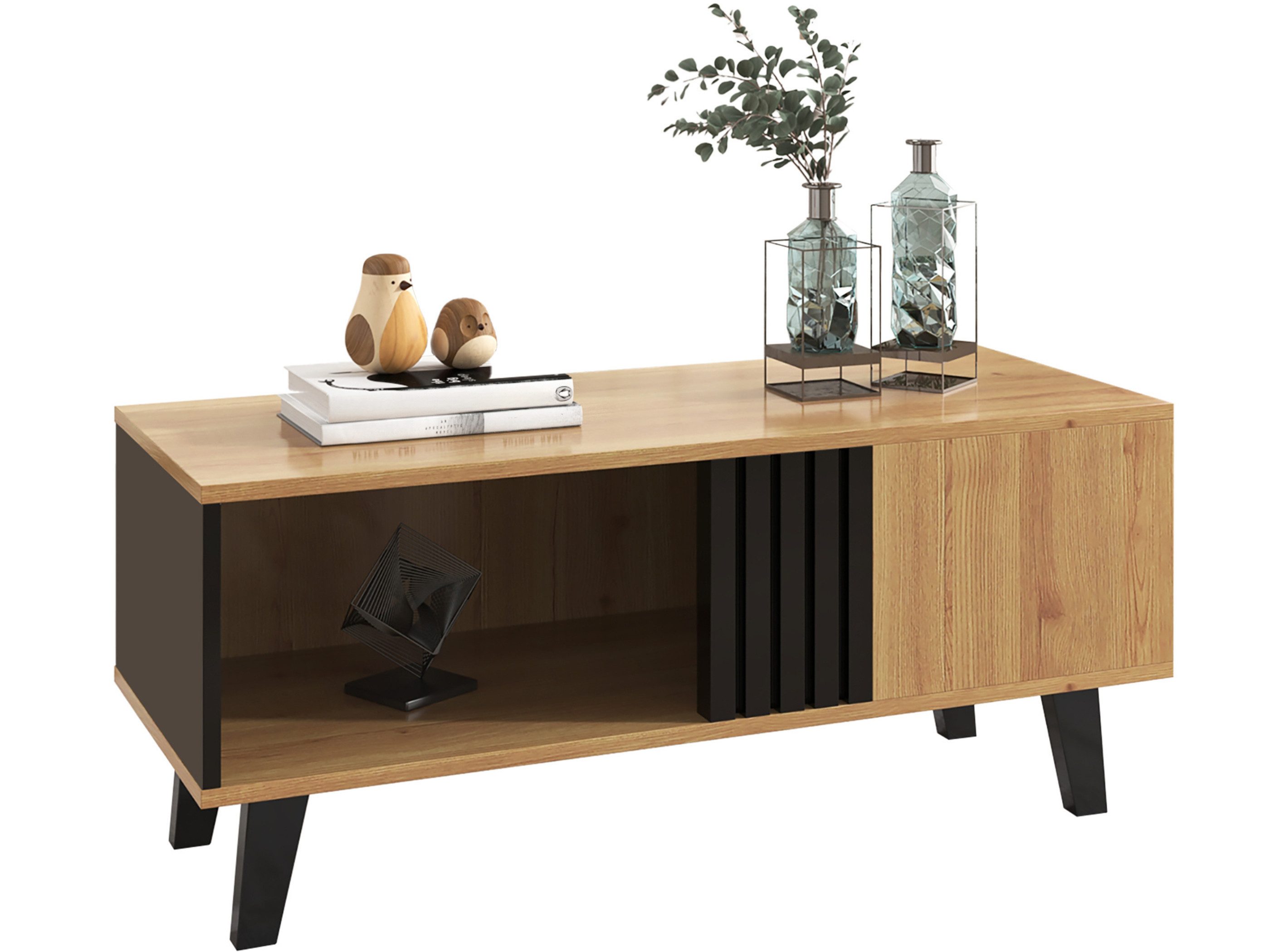 Dieser moderne Couchtisch verbindet funktionale Raffinesse mit stilvollem Design und ist eine ideale Ergänzung für Ihr Wohnzimmer. Die Kombination aus einer authentischen Holz-Optik und schwarzen Akzenten verleiht dem Tisch eine zeitlose Eleganz, die sich nahtlos in verschiedene Einrichtungsstile einfügt. Neben einer großzügigen Ablagefläche bietet der Tisch ein geräumiges offenes Fach, das durch ein dezentes schwarzes Brett optisch aufgeräumt wirkt, während zwei zusätzliche Seitenfächer noch mehr Platz für Alltagsgegenstände schaffen. Die hochwertige, wasserabweisende Oberfläche sorgt für eine einfache Pflege und schützt den Tisch vor Feuchtigkeit und Flecken, was seine Langlebigkeit erhöht. Robuste Kunststoffbeine garantieren eine stabile Konstruktion, die den Tisch zuverlässig trägt und gleichzeitig für einen stilvollen Look sorgt. Ob als Ablage für Getränke, Fernbedienungen oder Dekoration – dieser Couchtisch kombiniert Ästhetik mit praktischer Funktionalität und macht Ihren Wohnbereich noch einladender.