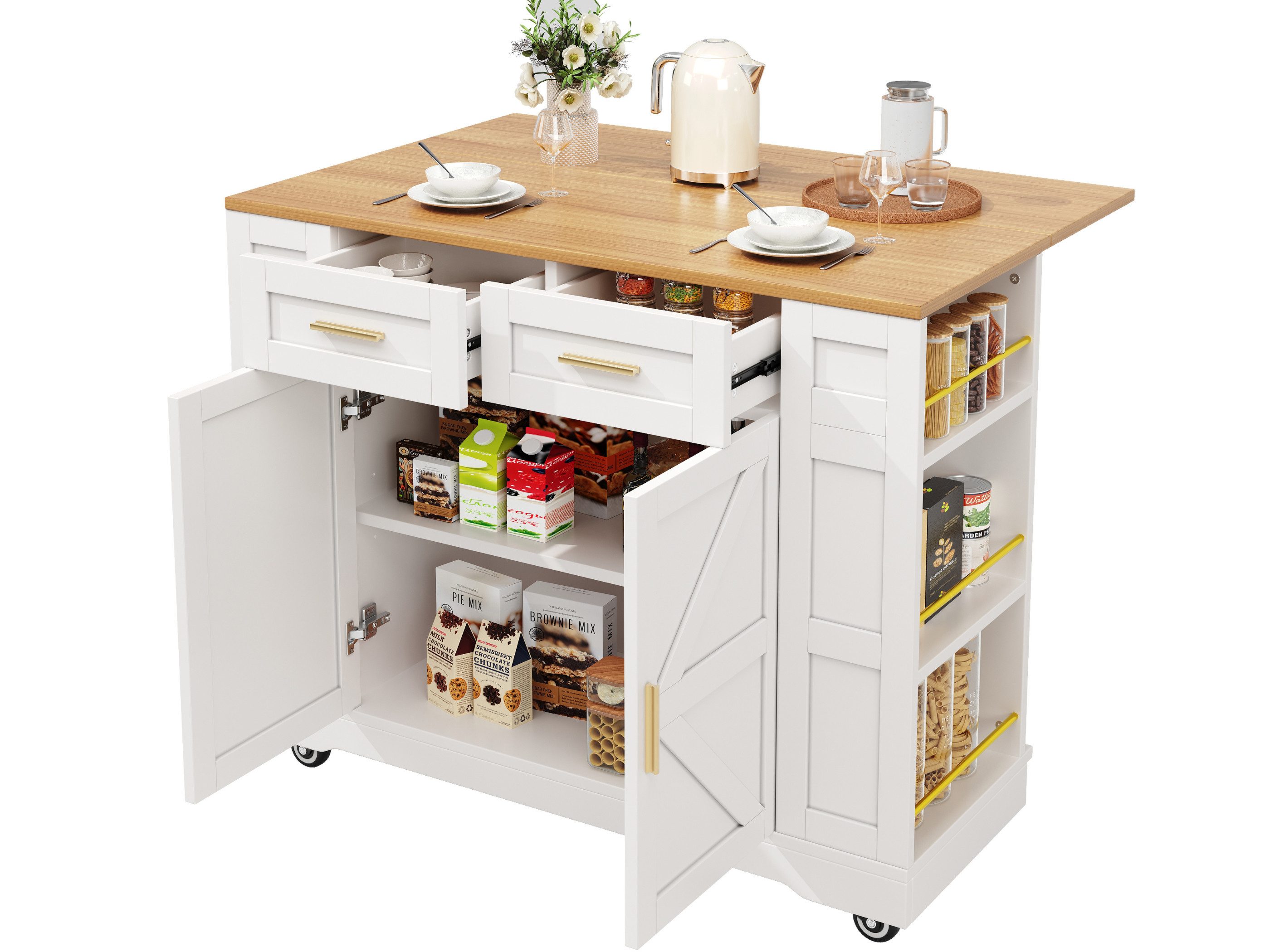 Diese elegante Kücheninsel vereint Funktionalität mit stilvollem Design und ist eine Bereicherung für jede Küche. Die Tischplatte in Holzoptik sorgt für eine natürliche Ausstrahlung und bietet viel Arbeitsfläche. Zwei Schubladen und zwei geschlossene Staufächer ermöglichen eine strukturierte Aufbewahrung verschiedenster Küchenutensilien. An den Seiten befinden sich insgesamt sechs Gewürzboards mit Sicherheitsgeländern – ideal für alles, was griffbereit sein soll. Abgerundet wird das Design durch goldfarbene Griffe und vier feststellbare Rollen, die maximale Flexibilität bei gleichbleibender Stabilität bieten. Eine ideale Lösung für zusätzlichen Stauraum, Organisation und modernes Küchendesign.