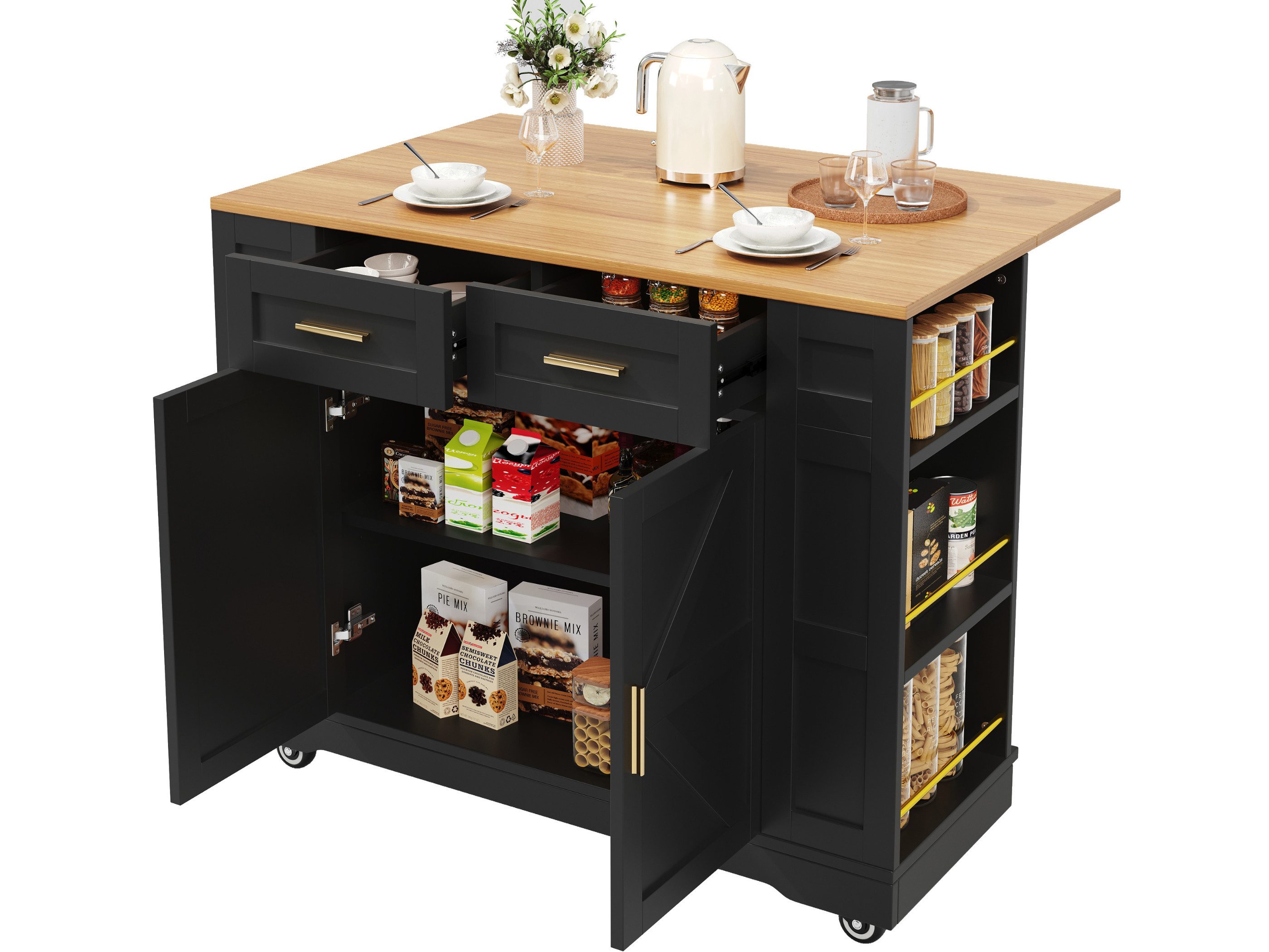 Seitliche Gewürzboards mit Schutzgeländern: Jeweils drei seitliche Ablageboards auf beiden Seiten bieten praktischen Stauraum für Gewürze, Flaschen oder Ölbehälter. Die stabilen Schutzgeländer sorgen dafür, dass alles sicher an seinem Platz bleibt – auch bei Bewegung. Diese offenen Fächer machen Gewürze jederzeit griffbereit und erleichtern das Kochen spürbar. Gleichzeitig dienen sie als optisches Highlight der Kücheninsel.