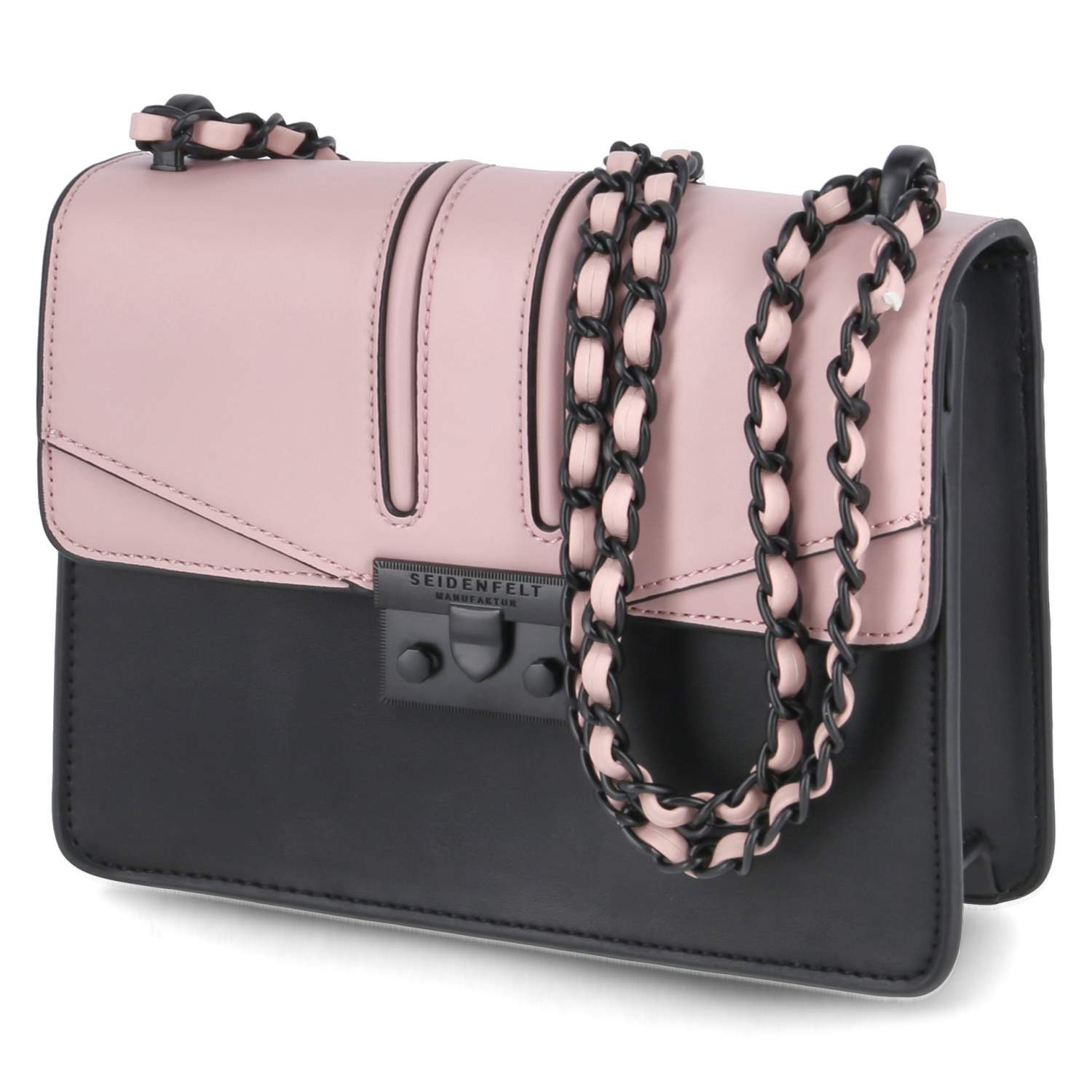Die Seidenfelt Damen Crossbody Bag ROROS aus schwarzem Kunstleder setzt mit ihrem rosa Überschlag einen modischen Akzent. Der Klickverschluss am rosa Überschlag verleiht der Tasche nicht nur ein besonderes Detail, sondern sorgt auch für ein sicheres Verschließen. Elegante Ziernähte ergänzen das Design, während die Kette (ca. 120 cm) vielseitige Tragemöglichkeiten als Crossbody oder Schultertasche bietet. Der verstärkte Boden garantiert eine stabile Form und Langlebigkeit. Im Inneren finden sich ein Reißverschlussfach und zwei Steckfächer für eine übersichtliche Aufbewahrung. Mit ihren Maßen von ca. 16 x 21 x 7 cm (HxBxT) ist diese Kombination aus schwarzem Kunstleder und rosa Elementen ein stilvoller Begleiter für jeden Anlass.