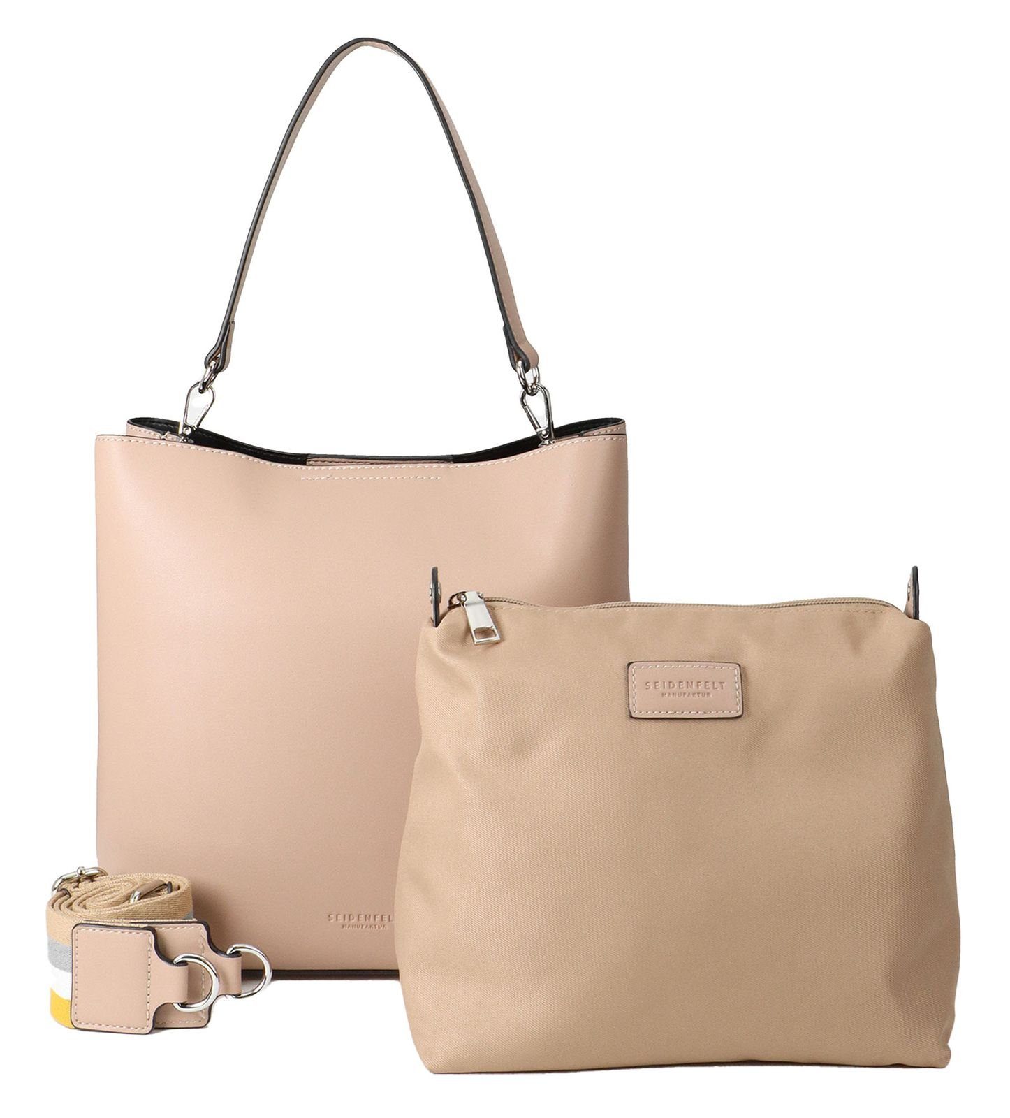 Dieses tolle Set von der Marke SEIDENFELT MANUFAKTUR ist der Wahnsinn! Die Umhängetasche begeistert durch ihr geräumiges Hauptfach, das schicke Design und einer erweiterbaren Öffnung durch zwei Zipper auf der rechten und linken Seite. Die drei abnehmbaren Tragemöglichkeiten ermöglichen viel Flexibilität. Ob als Schultertasche oder als Umhängetasche getragen, machen Sie mit diesem Prachtstück eine tolle Figur. Die zusätzliche Utensilientasche kann zudem mit zwei Druckknöpfen im Inneren der SEIDENFELT MANUFAKTUR Kerava HW22 befestigt werden.