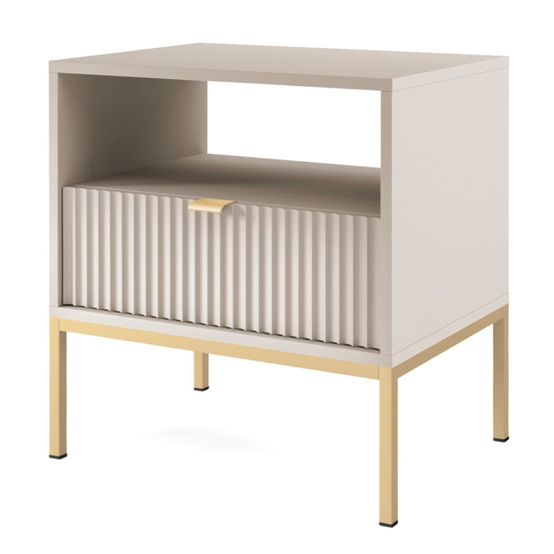 Der Nachttisch Vellore vereint modernen, minimalistischen Stil mit eleganten Details. Seine klaren Linien und das geometrische Design des Gestells schaffen eine zeitlose Ästhetik, die in jedes Zuhause passt. Ein glänzendes Gestell in Gold setzt einen edlen Akzent. Die geriffelte Front verleiht dem Tisch zusätzliche Tiefe und Struktur, während der schmale, goldene Griff das Design abrundet und den luxuriösen Charakter unterstreicht.