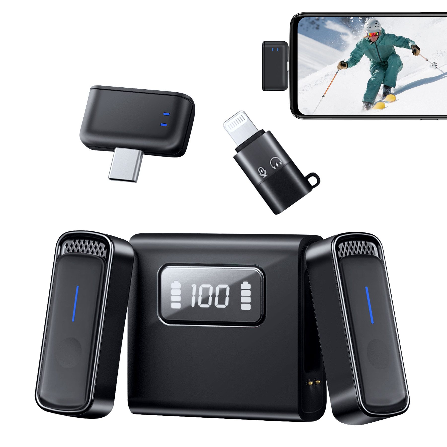 Entdecken Sie dasultimative Mikrofon fürIhre Live-Übertragungen und kurzen Videos mit unserem 360-Grad-Rundum-Mikrofon.Dieses drahtlose Lavalier-Mikrofon, das sowohl mit iOS/Android/iPhone-Geräten kompatibel ist, bietet eine außergewöhnliche Audioqualität undFlexibilität. Dank der magnetischen Ladeschale ist das Mikrofon stetseinsatzbereit und bietet eine einfache und komfortable Ladelösung.