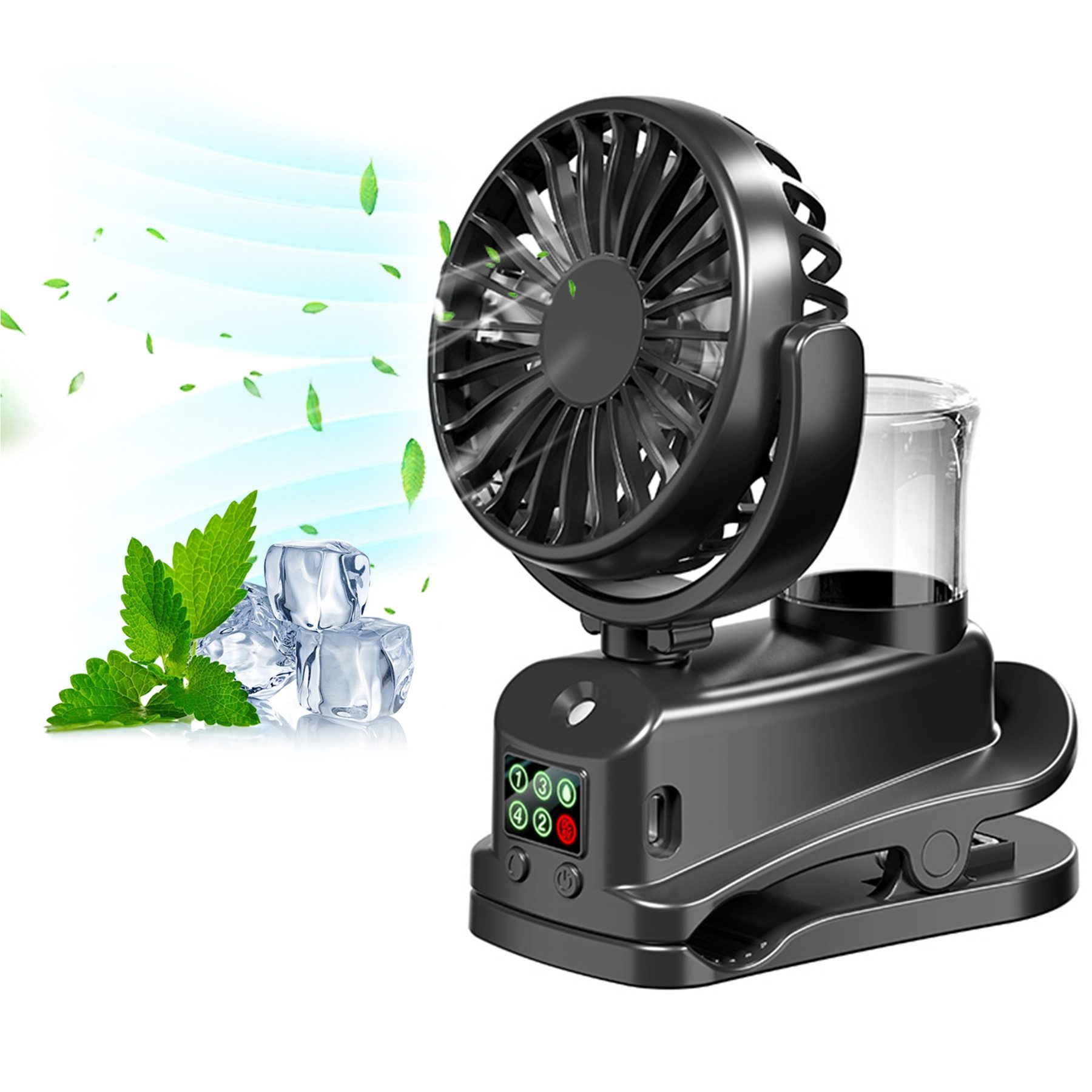 Ausstattung | Sprühfunktion Clip-Befestigung LED-Anzeige Typ-C-Ladeanschluss 4 Geschwindigkeitsstufen Leiser Betrieb 360° drehbar Tragbar Akku-Betrieb |