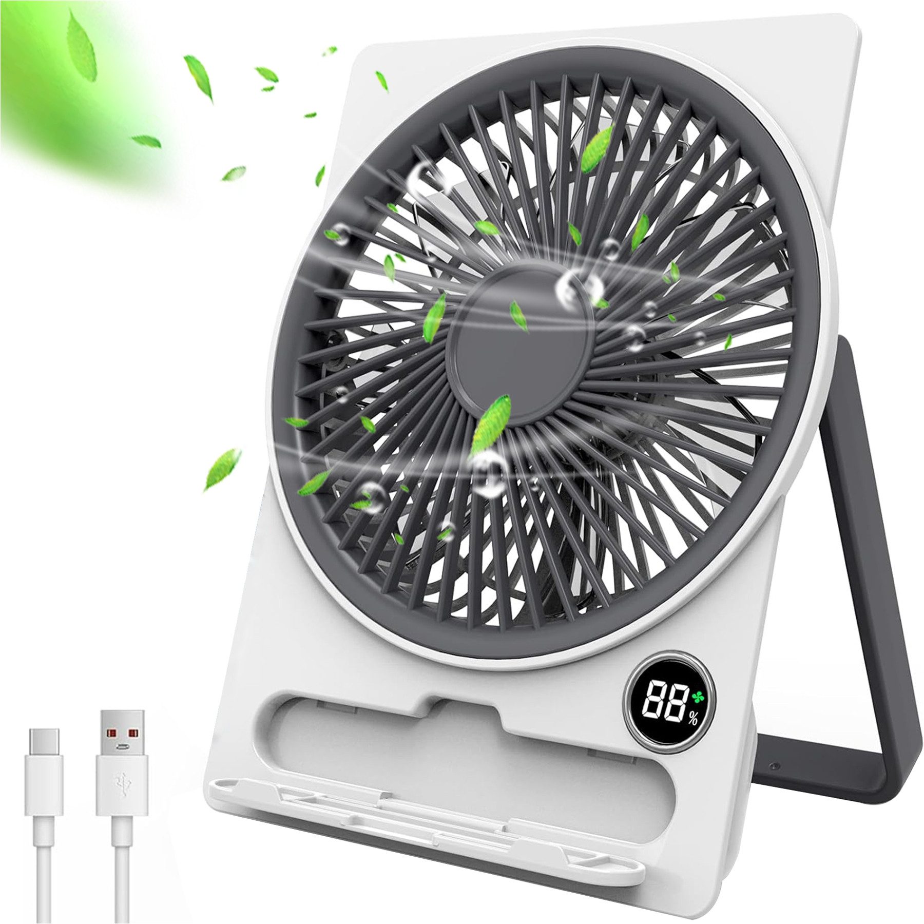 Ein integrierter LED-Digital-Bildschirm zeigt Ihnen den Batteriestand in Echtzeit an, während der stabile Sockel für sicheren Halt sorgt. Der Mini-Ventilator kombiniert Funktionalität und modernes Design für Ihr Wohlbefinden.