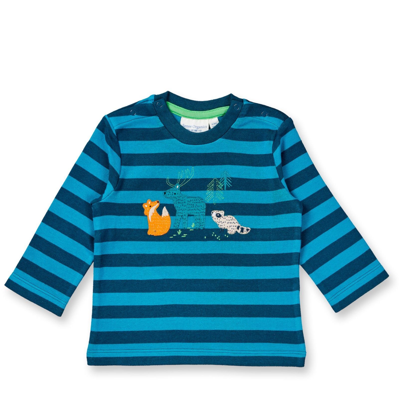 Tiermotive bleiben immer in Mode! Unser nachhaltiges Langarmshirt für Babys bekommst du in zwei Farbvarianten: Stahlblau-sand geringelt mit Fuchs oder Dunkelblau-petrol geringelt mit Fuchs, Hirsch und Waschbär. Das niedliche Shirt hat einen klassischen Rundhalsausschnitt mit nickelfreien Druckknöpfen an einer Schulter, die ein einfaches An- und Ausziehen ermöglichen. Die langen Ärmel ohne Bündchen bieten deinem Baby ganz viel Bewegungsfreiheit. Der gerade Schnitt garantiert eine bequeme Passform. Modell ELAN besteht aus 100% hautfreundlicher Bio-Baumwolle und ist in den Größen 50/56 bis 92 erhältlich. Der weiche Interlock-Stoff fühlt sich supersoft an und beugt Irritationen auf der Haut vor.