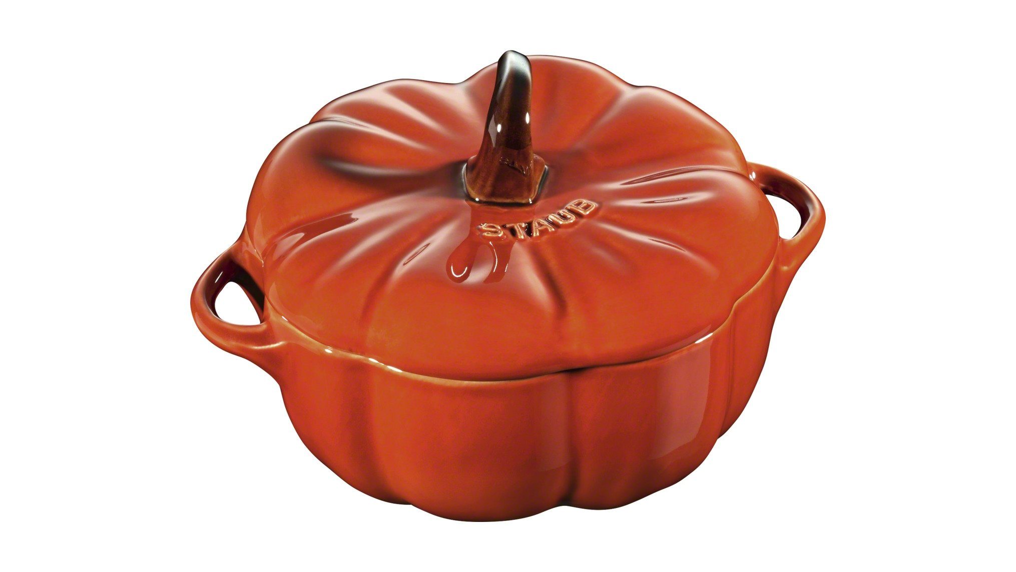 Staub Kürbis cocotte Ceramic by Staub 13 cm 5 1/8 " Breite: 12,2 cm Hitzebeständigkeit: ja Höhe: 10,5 cm Induktionsfähigkeit: nein Довжина: 16 cm Volumen: 0,5 l Volumen: 16- Die Kürbis-Cocotte der Reihe Keramik ist ein kleiner Topf, in dem Sie Speisen zubereiten und auch direkt servieren können. Aufgrund des Bodendurchmessers von 8,8 cm und einer Füllmenge von 0,5 l eignet sie sich perfekt für eine Portion. Die Keramik-Kürbis-Cocotte ist durch ihre besondere Form und ihren Farbton in Zimt ein echter Hingucker. Die hochwertige Keramik verteilt die Wärme optimal und verfügt über eine leicht zu reinigende Oberfläche. Mit diesem Produkt von Staub kann das Essen sehr dekorativ auf den Tisch gestellt werden. Ideal für ein portionsweises Zubereiten und Servieren Vielseitig einsetzbar Leicht zu reinigen Dank emaillierter Oberfläche Geeignet für den Einsatz in der Mikrowelle und im Backofen