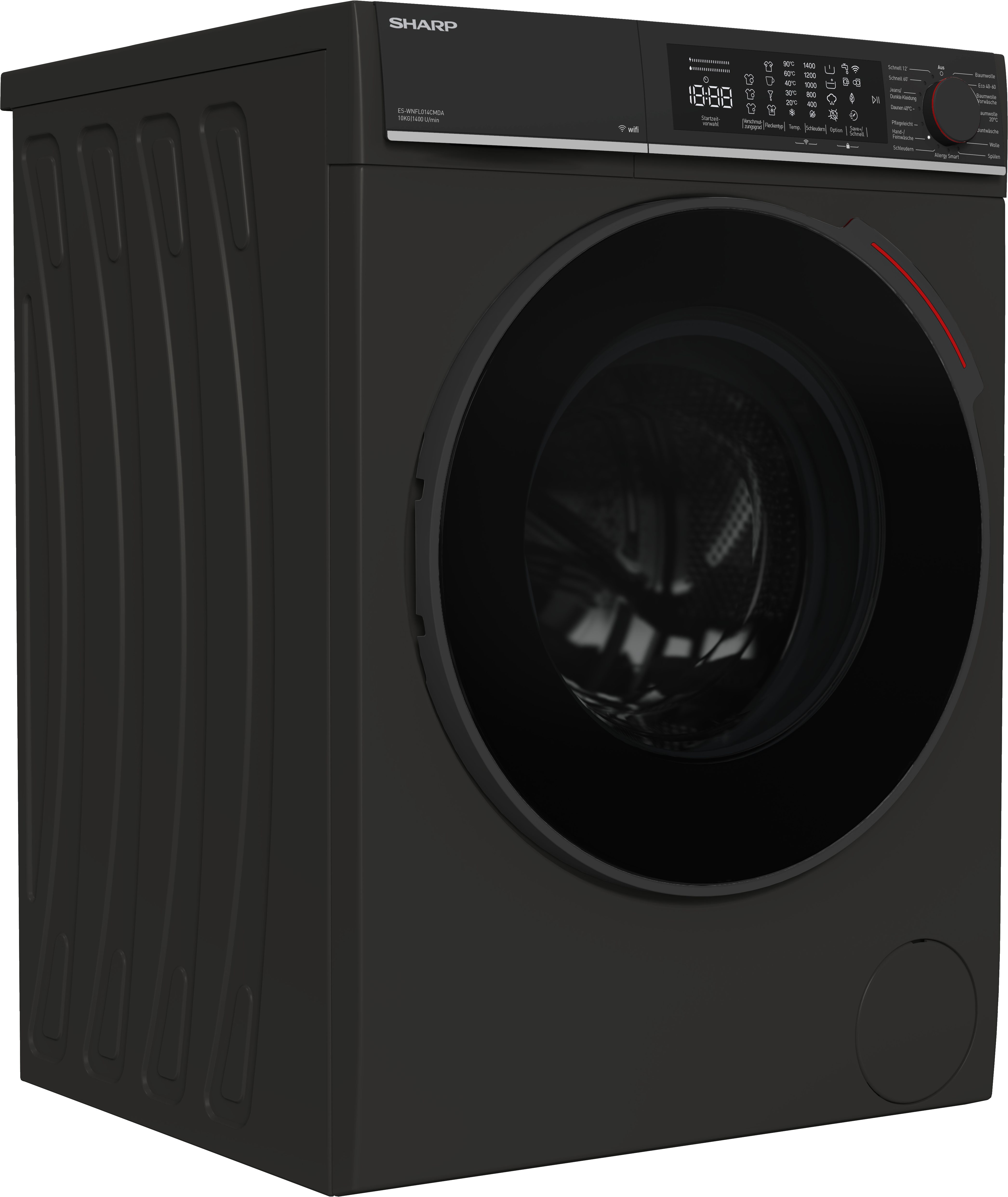 Die Waschmaschine ES-WNFL014CMDA-DE von Sharp glänzt durch eine überzeugende Ausstattung. Ausgezeichnet mit der Energieeffizienzklasse A (Skala: A bis G) fällt der Energiebedarf dieser Waschmaschine äußerst niedrig aus. Die Kapazitätsanforderungen von Familien ab 5 Personen stellen mit einem 10 kg Fassungsvermögen kein Problem dar. Darüber hinaus bietet die ES-WNFL014CMDA-DE Waschmaschine unter anderem diese Top-Features: AquaStop, Dampffunktion, Extra Spülen, Fleckenoption und WiFi-Smart Control. Die Schaumerkennung legt einen extra Spülgang ein, sodass keine Waschmittelrückstände in den Textilien bleiben, selbst wenn einmal zu viel Waschmittel in der Trommel ist. Über die Startzeitvorwahl lässt sich einstellen, wann die ES-WNFL014CMDA-DE Waschmaschine mit dem Waschen anfängt. Das ist insbesondere dann praktisch, wenn die Wäsche fertig sein soll, sobald man zu Hause ankommt. Die verbleibende Programmdauer wird auf der Restlaufanzeige dargestellt. So weiß man jederzeit, wie lange die Waschmaschine noch für den Waschgang braucht. Darüber hinaus lässt sich die ES-WNFL014CMDA-DE Waschmaschine durch eine Kindersicherungsfunktion sperren. Die Abmessungen der Waschmaschine betragen 59,7 cm x 84,5 cm x 58,2 cm (BxHxT).