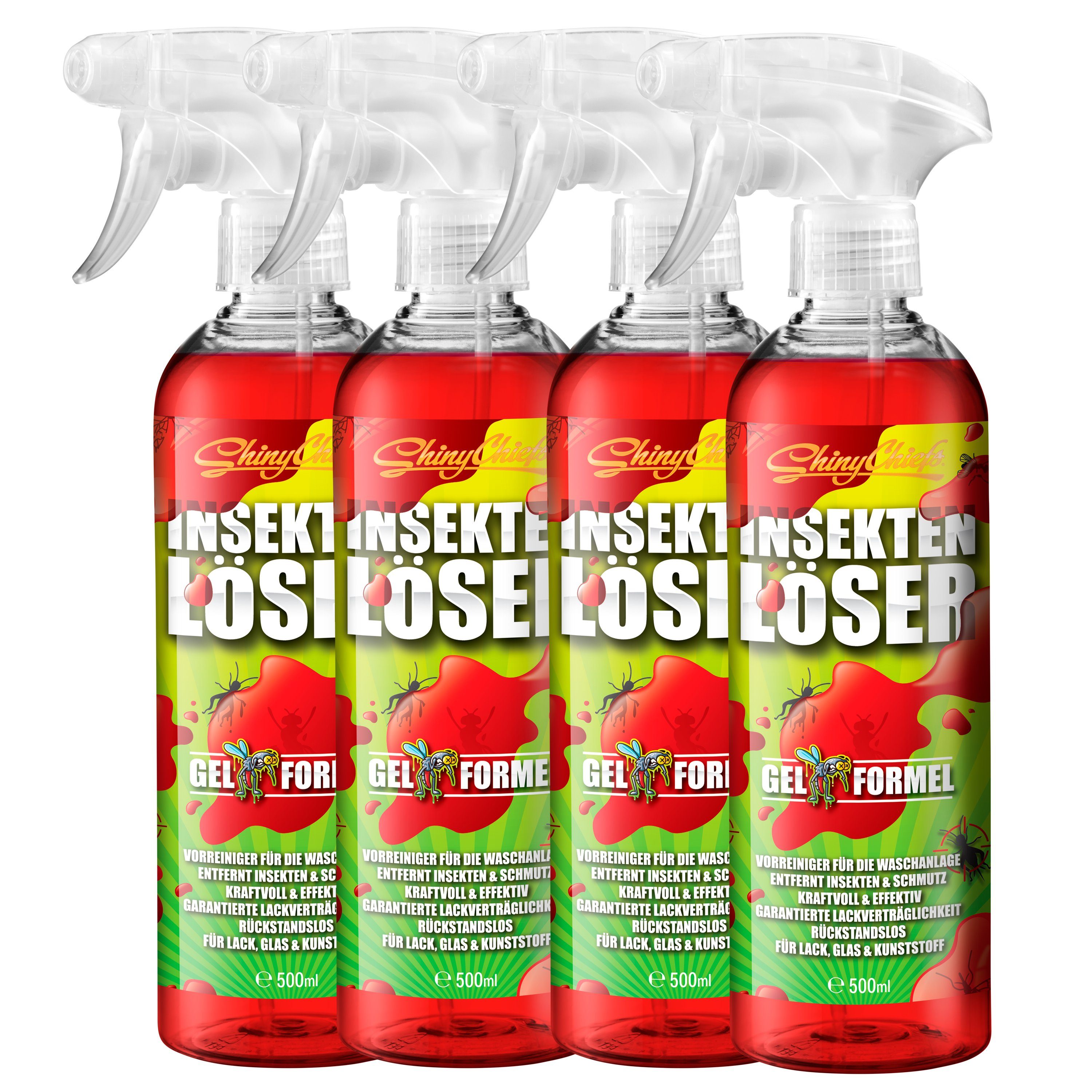ShinyChiefs INSEKTENLÖSER ist der ideale Vorreiniger für die Waschanlage, um kraftvoll und effektiv alle Insektenreste von dem Fahrzeug im Frontbereich (z.B. Frontscheibe, Motorhaube, Stoßstange, Kühlergrill, Scheinwerfer) hervorragend und schnell zu entfernen und das ohne aggressive Inhaltsstoffe. Der INSEKTENLÖSER wird auf die verschmutzte Oberfläche gesprüht, weicht die Insektenüberreste ein und löst diese von allen Bereichen des Fahrzeuges. Dank der speziell, sehr stark entwickelten Gel-Formel haftet das Produkt perfekt an der Karosserie, ist äußerst sparsam in der Anwendung und kann bei den betroffenen Stellen seine Wirkung grandios entfalten. Das Gel läuft nicht ab und kann so besser einwirken. Durch das Kriechvermögen des Reinigers werden selbst angetrocknete Insektenverschmutzungen von Lack, Glas, Chrom und Kunststoff gründlich und einfach gelöst, ohne die Oberflächen anzugreifen.