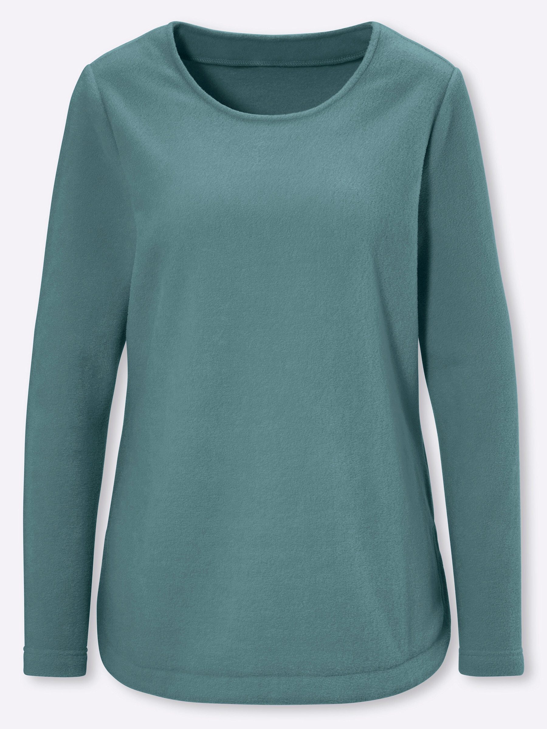Warmes Shirt mit langen Ärmeln, die auch wirklich bis zum Handgelenk gehn. Die Farbe sieht eher wie Mint aus, was mir allerdings noch besser gefällt. Flauschig warm und mit 70 cm auch etwas länger. Das das Material zu steif bzw zu hart wäre, kann ich nicht nachvollziehen, im Gegenteil, es ist kuschelig weich und die Verarbeitung auch sehr gut. In 2 Farben habe ich es jetzt, werde mir aber auch noch die 3 anderen Farben bestellen, denn dafür ist der Preis unschlagbar.