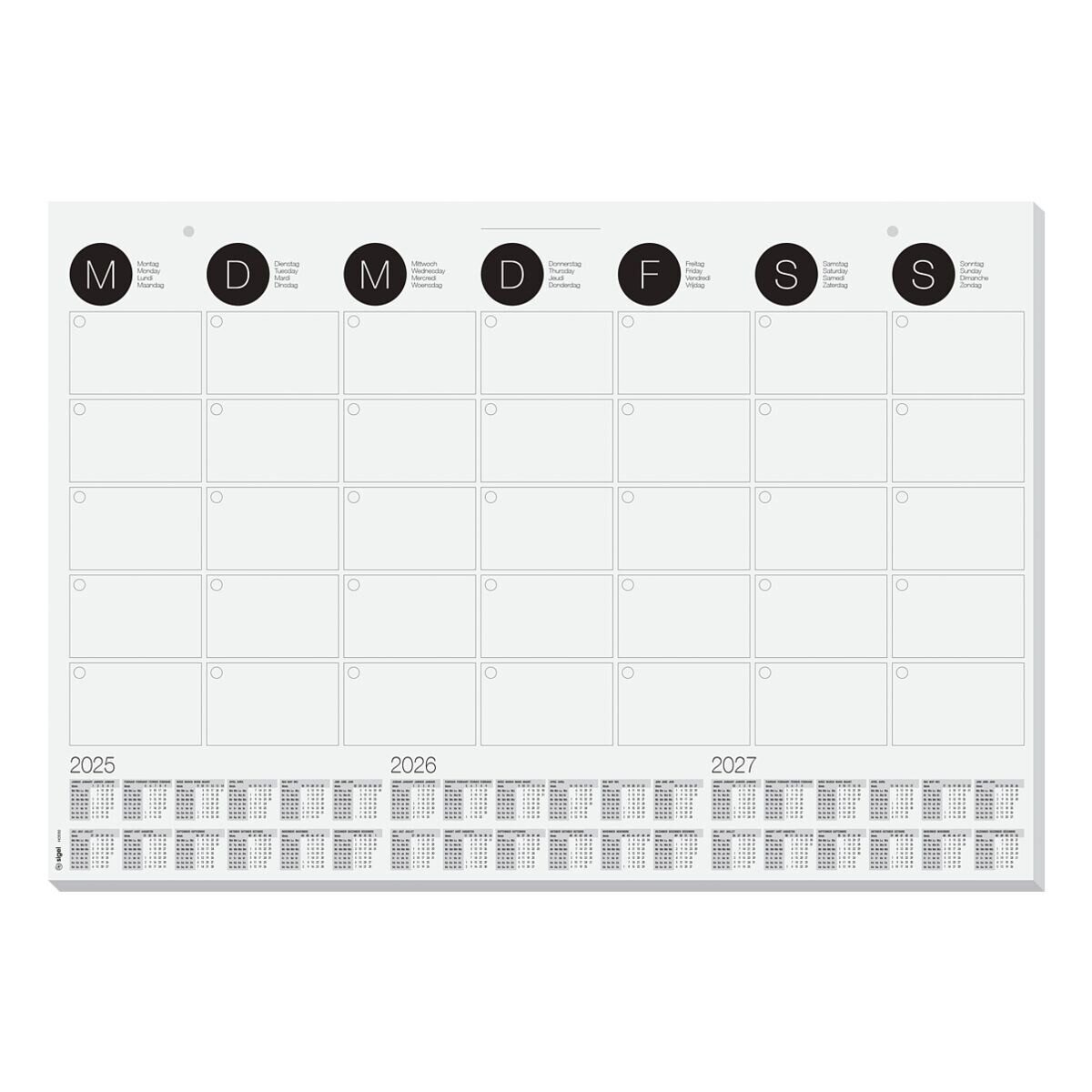 Papier-Schreibunterlage HO550, Ausführung: Monatsübersicht, zur individuellen Gestaltung und Planung, mit 3-Jahres-Kalendarium, Leimbindung an der Unterkante und partielle Leimung dem oberen Ecken verhindert das Umknicken der Ecken, kann auch als Wandkalender verwendet werden, mit Zweifach-Lochung zum Aufhängen, Format: DIN A2, Material: holzfreies Papier, Grammatur: 120 g/m², Farbe: schwarz-weiß, Inhalt: 12 Blatt