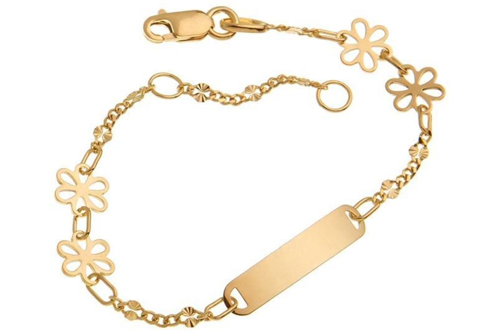 Wunderschönes, filigranes Baby- / Kinder-Armband mit Gravurplatte aus echt 375 Gelbgold. Das Gravurplättchen hat die Розмір von 20x4mm. In das Armband, rechts und links von der Gravurplatte eingearbeitet, sind 4 filigrane Blumen, zwischen den Kettengliedern sind kleine Schleifen. Durch eine Zwischenöse 2cm vor dem Verschluss ist das Armband verkürzbar. Ein passender Karabinerverschluss ergänzt das zarte Armbändchen. Beachten Sie bitte, bei der Armbandlänge 12cm sind auf jeder Seite der Gravurplatte jeweils nur eine Blume.