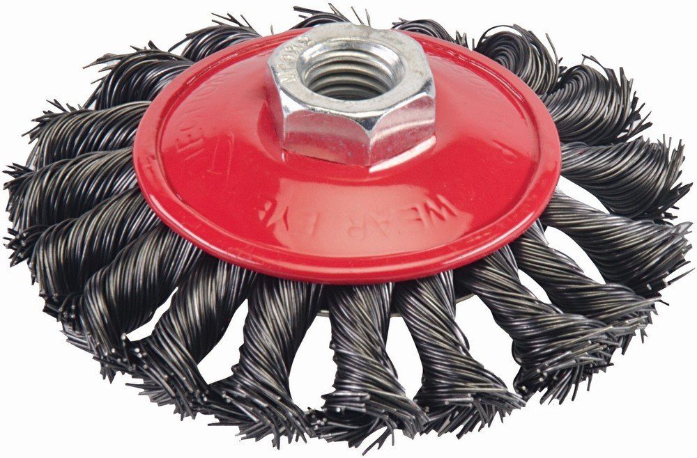 Hochfester Stahldraht mit 0,5 mm Durchmesser. Zum Entfernen von Rost, Farbe und Kesselstein sowie zum Entgraten und Vorbereiten von Schweißnähten. Zur Bearbeitung von Metall und Gestein, zum Säubern, für die Oberflächenvorbereitung und Застосуватиungsarbeiten. Für den Einsatz mit Winkelschleifern. M14 x 2-Innengewinde.