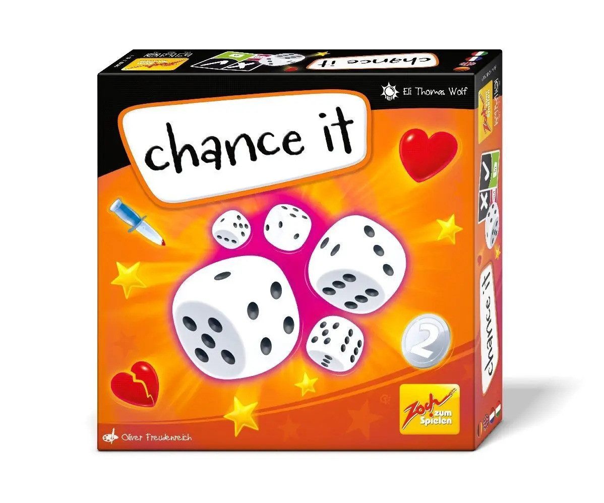 Würfelspiel - Chance it. Für 3-6 Spieler ab 10 Jahren. Die 5 Würfel liegen günstig oder?! Sind sie gefallen, entscheiden alle Spieler, ob sie damit nach den Sternen greifen - oder lieber dem Risiko aus dem Weg gehen, eigene Herzen zu verlieren. Wer sich die meisten Sterne sichert, gewinnt. Wer jedes Herz verliert, hat seine letzte Chance verspielt. Mit zusätzlichen Karten lassen sich Würfel wertvoller und gefährlicher für die Herzreserven der Mitspieler machen. Eine Chance-it-Karte pro Spieler lässt die eigenen Einnahmen stärker sprudeln, aber auch das Risiko anschwellen, ungewollt an einer verlustreichen Spielrunde mitzuwirken. Raffinierte Risikoabwägung und Würfel, die jede Spekulation in die Irre leiten können, machen Chance it zu einem besonders herausfordernden Zockerspiel mit Herz.