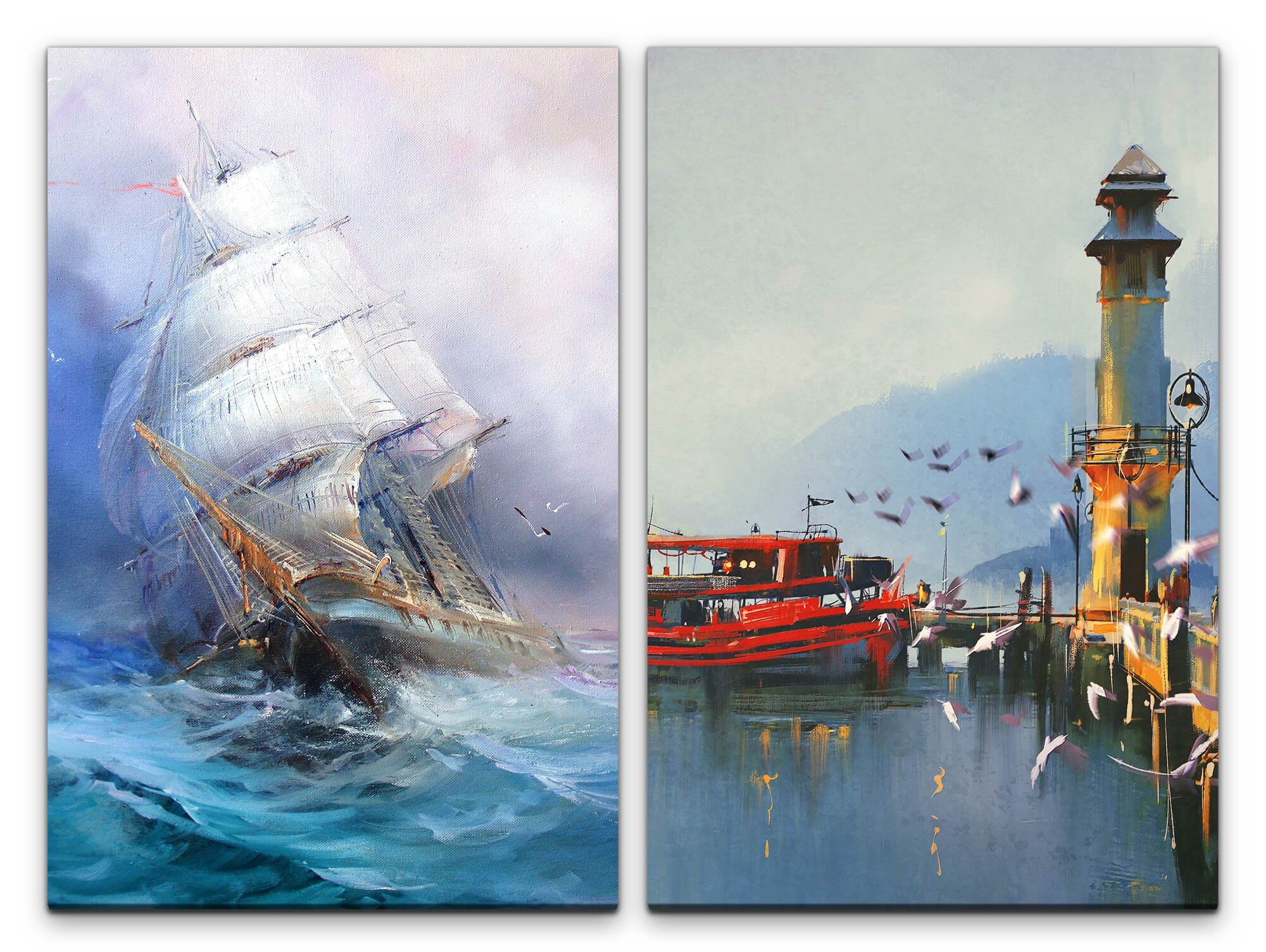 Sinus Art Leinwandbild 2 Bilder je 60x90cm Segelschiff Seefahrer Meer Sturm Wellen Malerisch Hafen