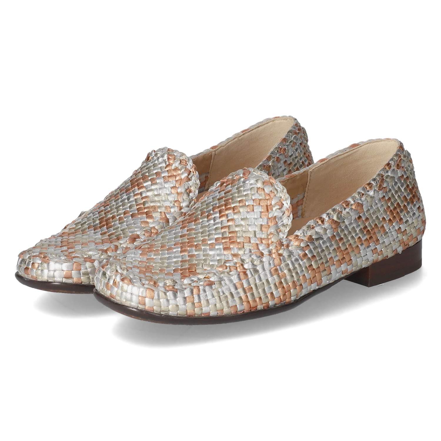Die Sioux Damen Mokassins/Loafer/Slipper CORDERA aus mehrfarbigem Glattleder beeindrucken mit ihrer schimmernden, geflochtenen Oberfläche, die dem Schuh einen außergewöhnlichen und trendigen Look verleiht. Das Modell punktet mit einer sorgfältig verarbeiteten, gepolsterten Lederdecksohle, die für optimale Dämpfung und hohen Tragekomfort sorgt, während das hochwertige Lederfutter ein angenehmes Fußklima gewährleistet. Die flexible, rutschhemmende Laufsohle sorgt für sicheren Halt auf verschiedensten Untergründen, und der stabile Blockabsatz verleiht der Silhouette zusätzlich Eleganz und Stabilität. Modetipp: Kombinieren Sie diese vielseitigen Mokassins mit einer schmal geschnittenen Stoffhose oder Jeans und einem dezenten Oberteil, um einen lässig-eleganten Look zu kreieren, der sowohl im Büro als auch in der Freizeit überzeugt. Dieses Modell ist ideal für modebewusste Damen, die nicht nur Wert auf Funktionalität, sondern auch auf einen markanten, stilvollen Auftritt legen.