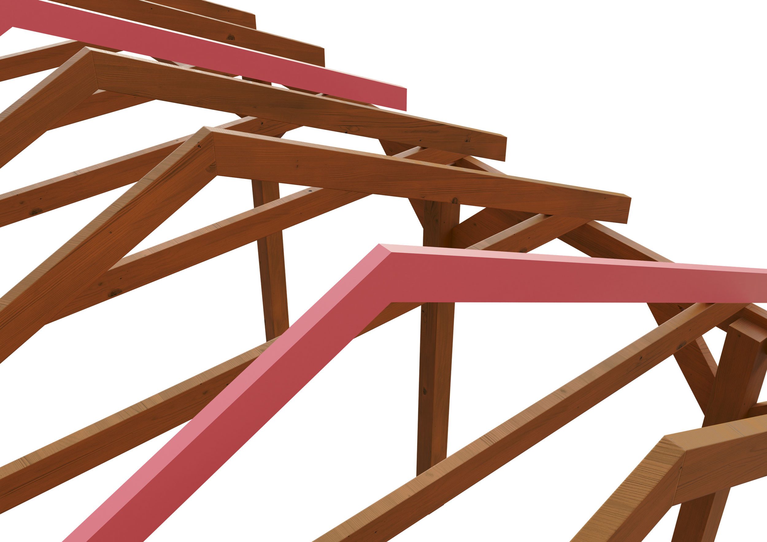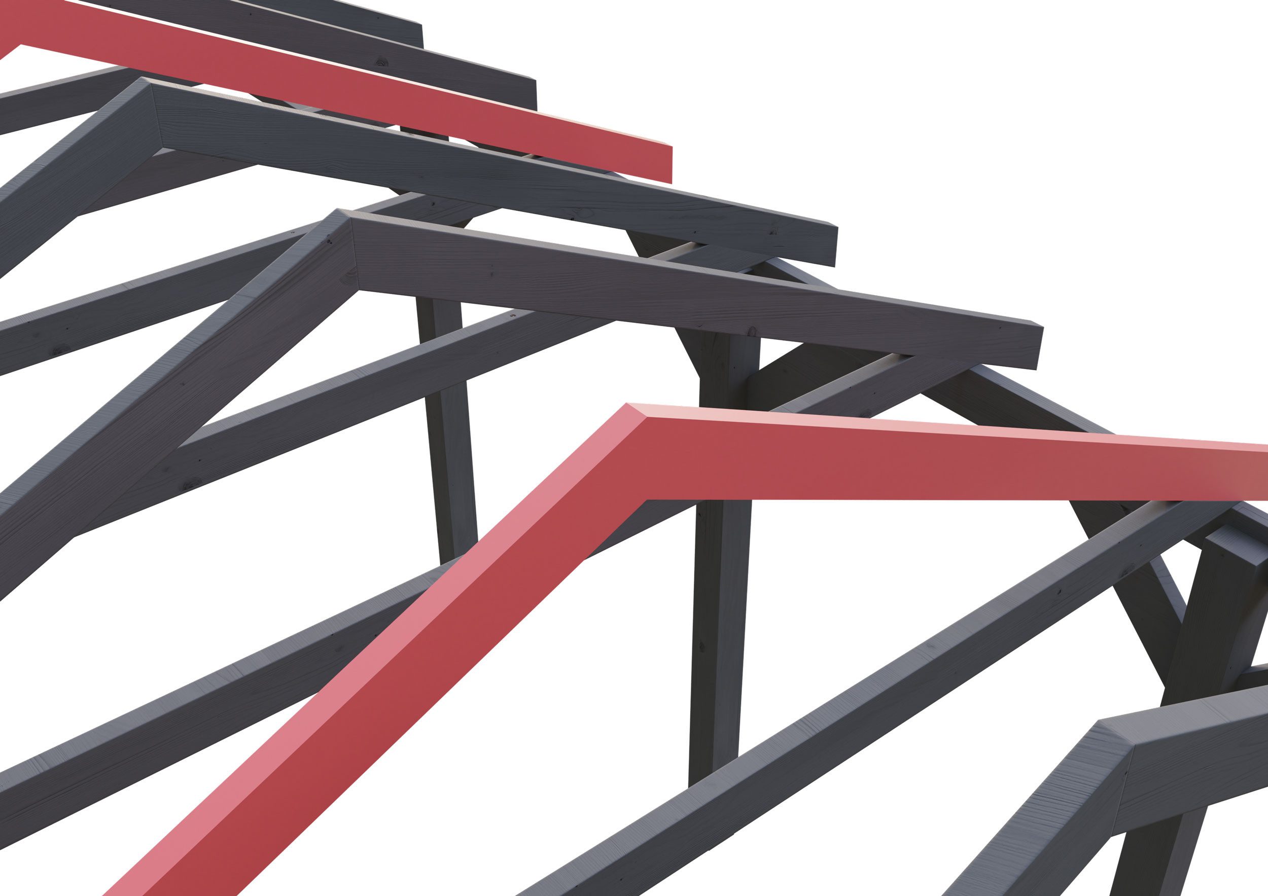 Die SKAN HOLZ Schneelasterhöhung besteht aus zusätzlichen Giebeldreiecken, die Sie zwischen die bestehenden Giebeldreiecke montieren. So verringern Sie den Sparrenabstand des Carports und erhöhen dadurch die Tragkraft insgesamt. Die Anzahl und Розмір der Sparren variiert je nach Carport.