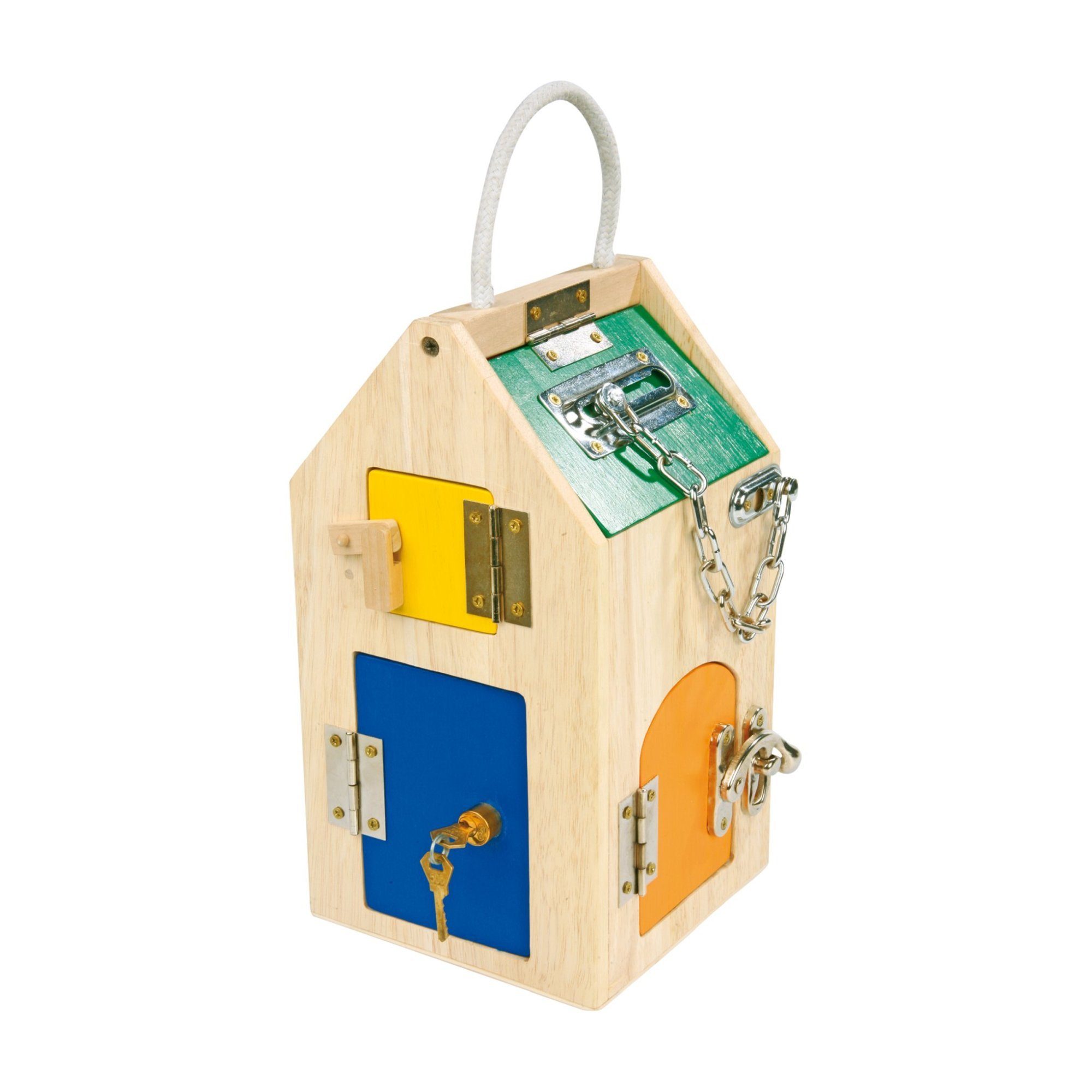 Das Schlosshaus ist ein hochwertig verarbeitetes Motorikspielzeug, das speziell für Kinder ab 3 Jahren entwickelt wurde. Es schult die motorischen Fähigkeiten und fördert das Lernen im Alltag. Das Haus besteht aus Metall und Holz und hat eine Розмір von ca. 15 x 15 x 28 cm. Es verfügt über ein Bügel- und Zylinderschloss, diverse Riegel, Hebel, Scharniere und eine Sicherheitskette. Mit dem Schlosshaus können Kinder spielerisch ihre motorischen Fähigkeiten verbessern und Schlüsselerlebnisse erleben. Das Material ist splitterfrei und reißfest, so dass das Spielzeug auch starker Beanspruchung standhält.