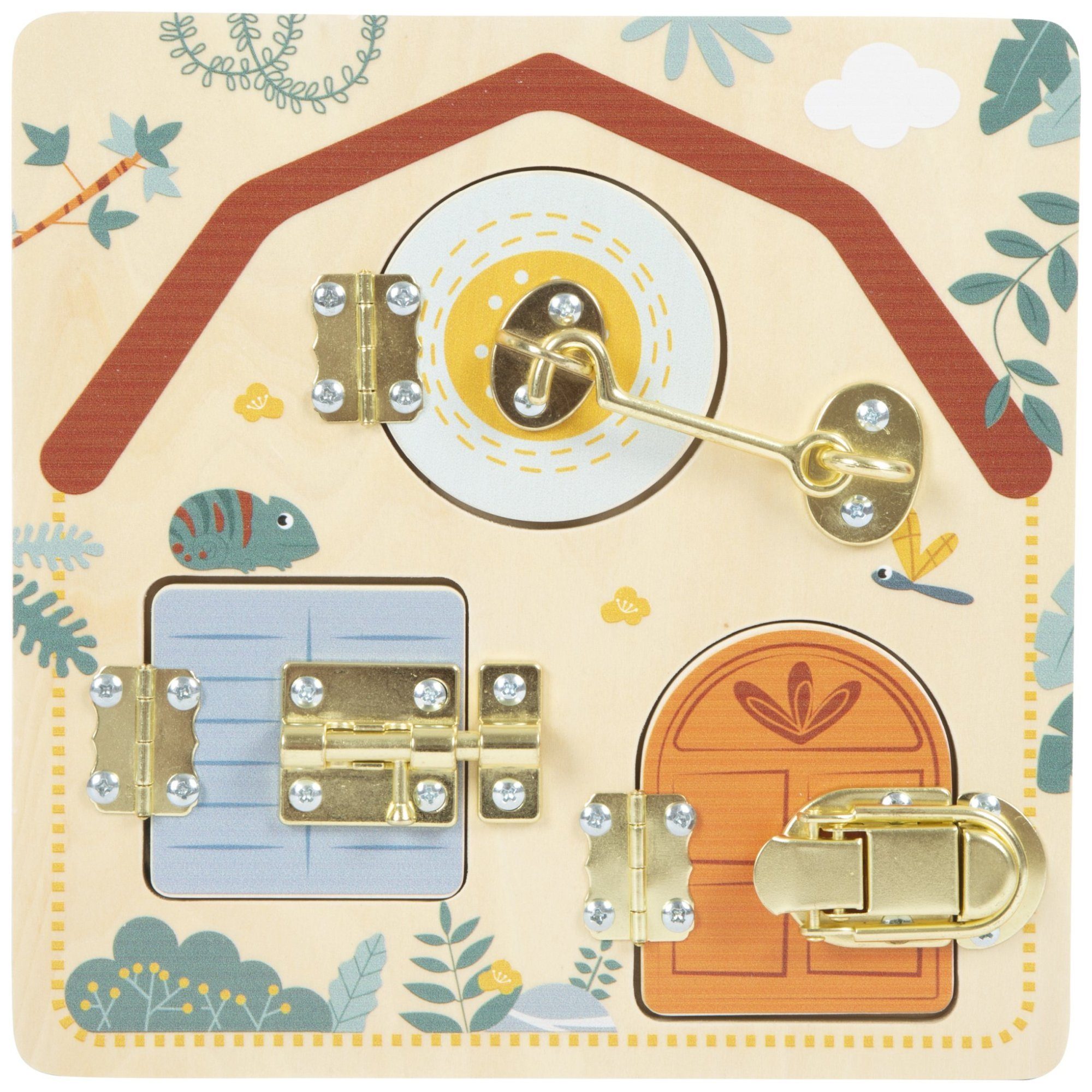 Сховати, öffnen, entdecken! Dieses liebevoll gestaltete Motorikbrett aus Holz bietet Kleinkindern vielseitige Spiel- und Lernmöglichkeiten. Das Lernbrett im exotischen „Safari“-Look verfügt über zwei Fenster und eine Tür, die mit unterschiedlichen Verschlüssen versehen sind und den Blick auf niedliche Tiere preisgeben. Beim Öffnen und Сховати von Riegelschloss, Türhaken und Schnappschloss lernen Kinder alltagspraktische Fähigkeiten und schulen ihre feinmotorischen Fähigkeiten. Ein tolles Montessori-Spielzeug, welches spielerisch das Greifen sowie die Hand-Augen-Koordination trainiert und die Motorik optimal fördert. Insbesondere die Gestaltung in Form eines Hauses sowie die farbenfrohe Optik in Kombination mit naturbelassenem Holz machen das Motorikbrett zu einem absoluten Liebling im Kinderzimmer.