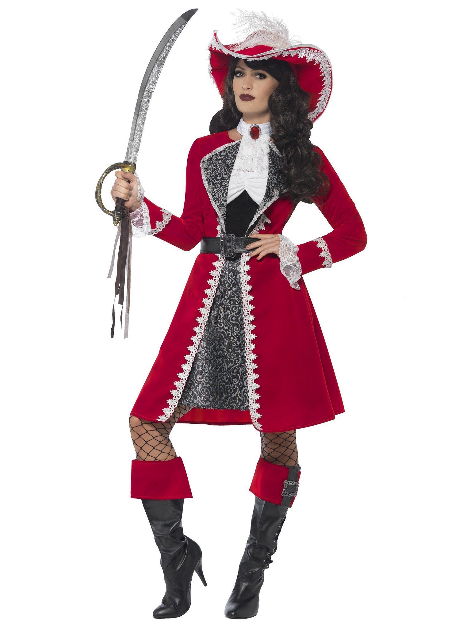Ausstattung | - Hook Piratin Kostüm fünfteilig- mit Kleid- mit Jackett- mit Jabot- mit einem Paar Stiefelstulpen- ohne Hut, Perücke und Säbel |