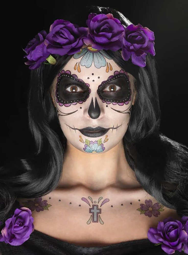 Lieferumfang | - Dia de los Muertos Schminkset schwarz-lila mehrteilig- mit Klebetattoos- mit Grundierung- mit Strasssteinchen- mit Schminkfarben |