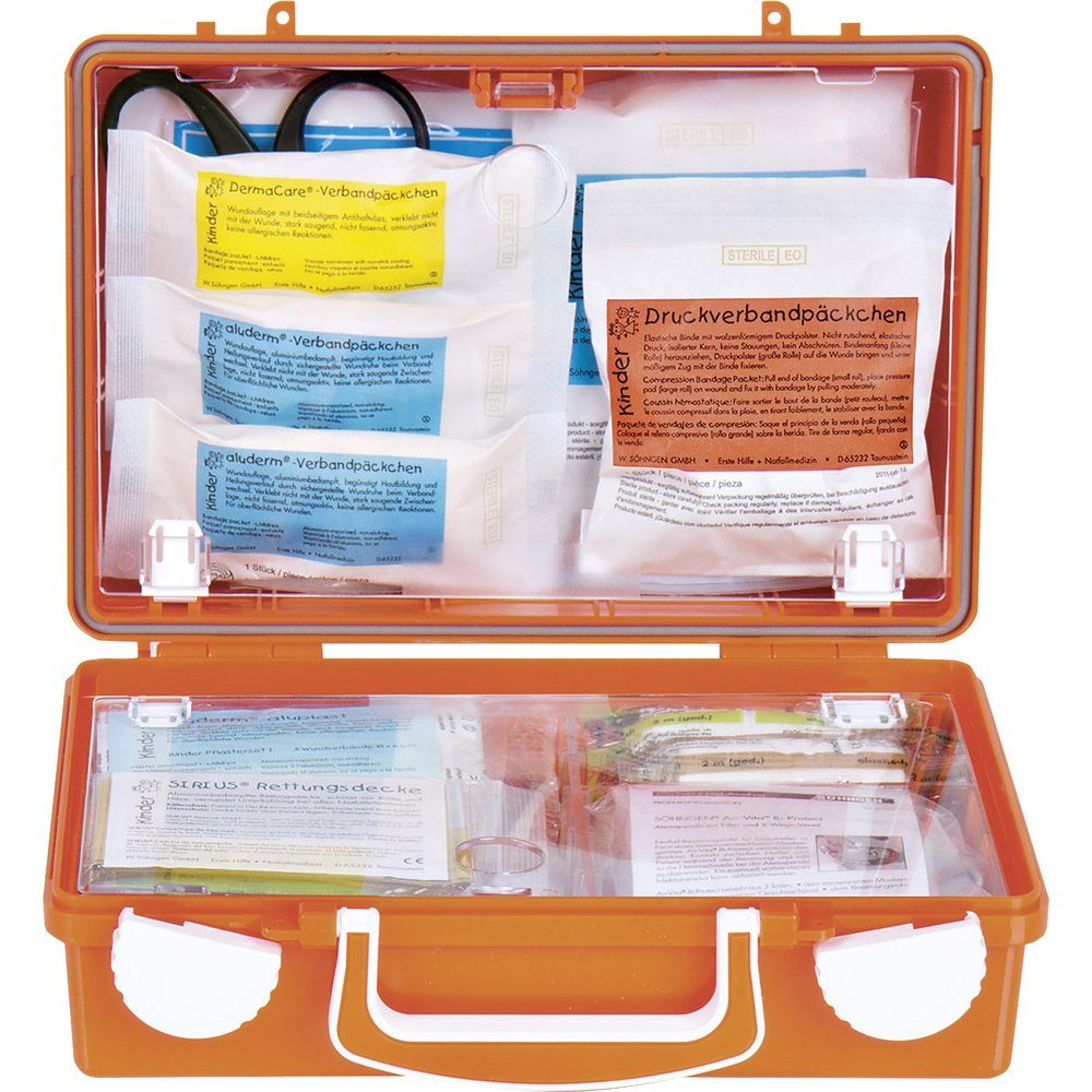 Erste-Hilfe-Koffer mit Spezialfüllung Schule für Grundschüler ab 6 Jahren.Koffer QUICK-CD · Material: ABS-Kunststoff, orange · Formbeständig, schlagfest, temperaturbeständig, spritzwassergeschützt, wartungsfrei · Inkl. Wandhalterung mit 90° Stop-Arretierung · Für mobilen und stationären Einsatz, kann problemlos der Halterung entnommen und zum Unfallort gebracht werden · Koffer mit umlaufender Gummidichtung · Inneneinteilung verstellbar, transparente Abdeckplatten, leichtgängige Drehverschlüsse, verstärkter Tragegriff, Plombiervorrichtung · Mit Siebdruckbeschriftung und Farbpiktogrammen