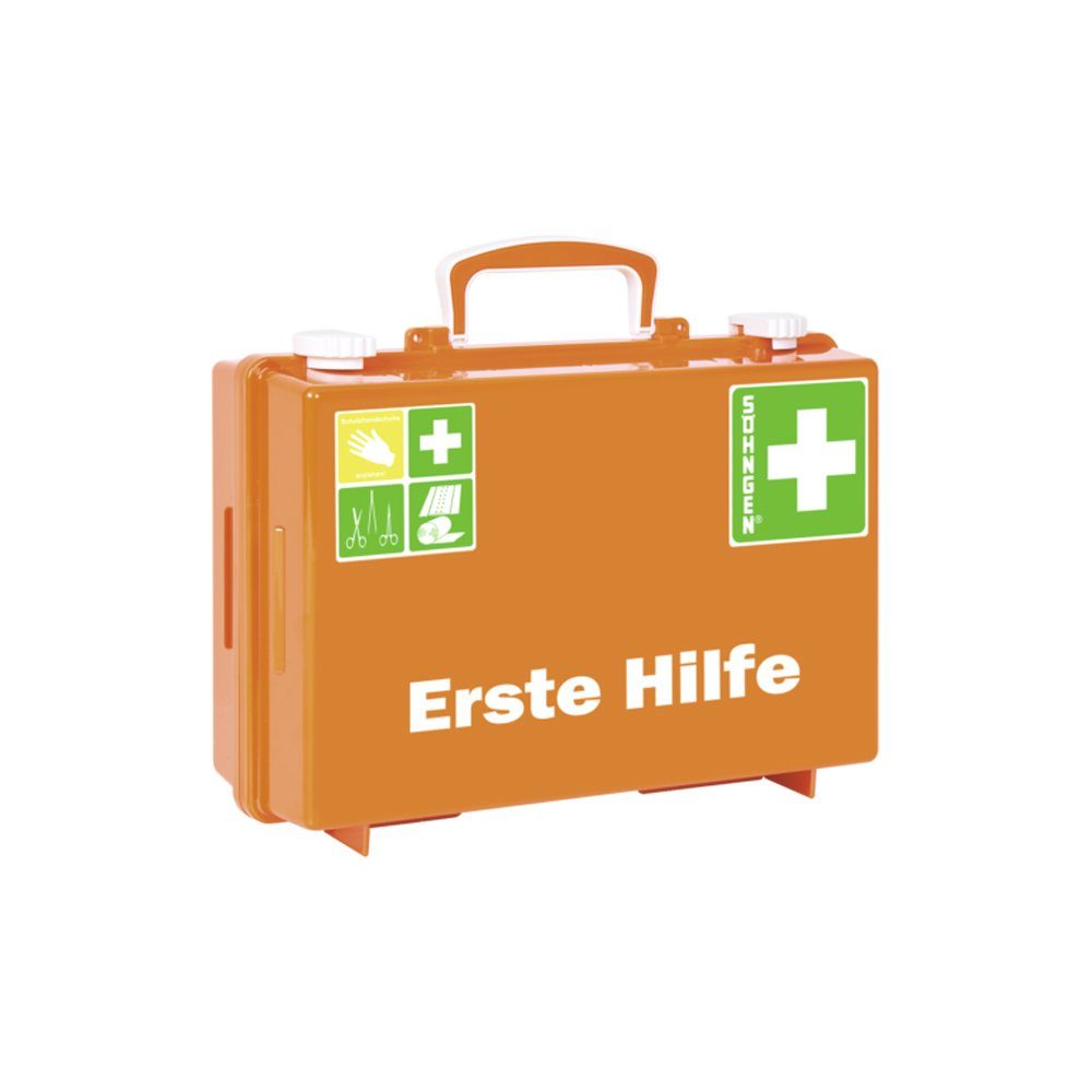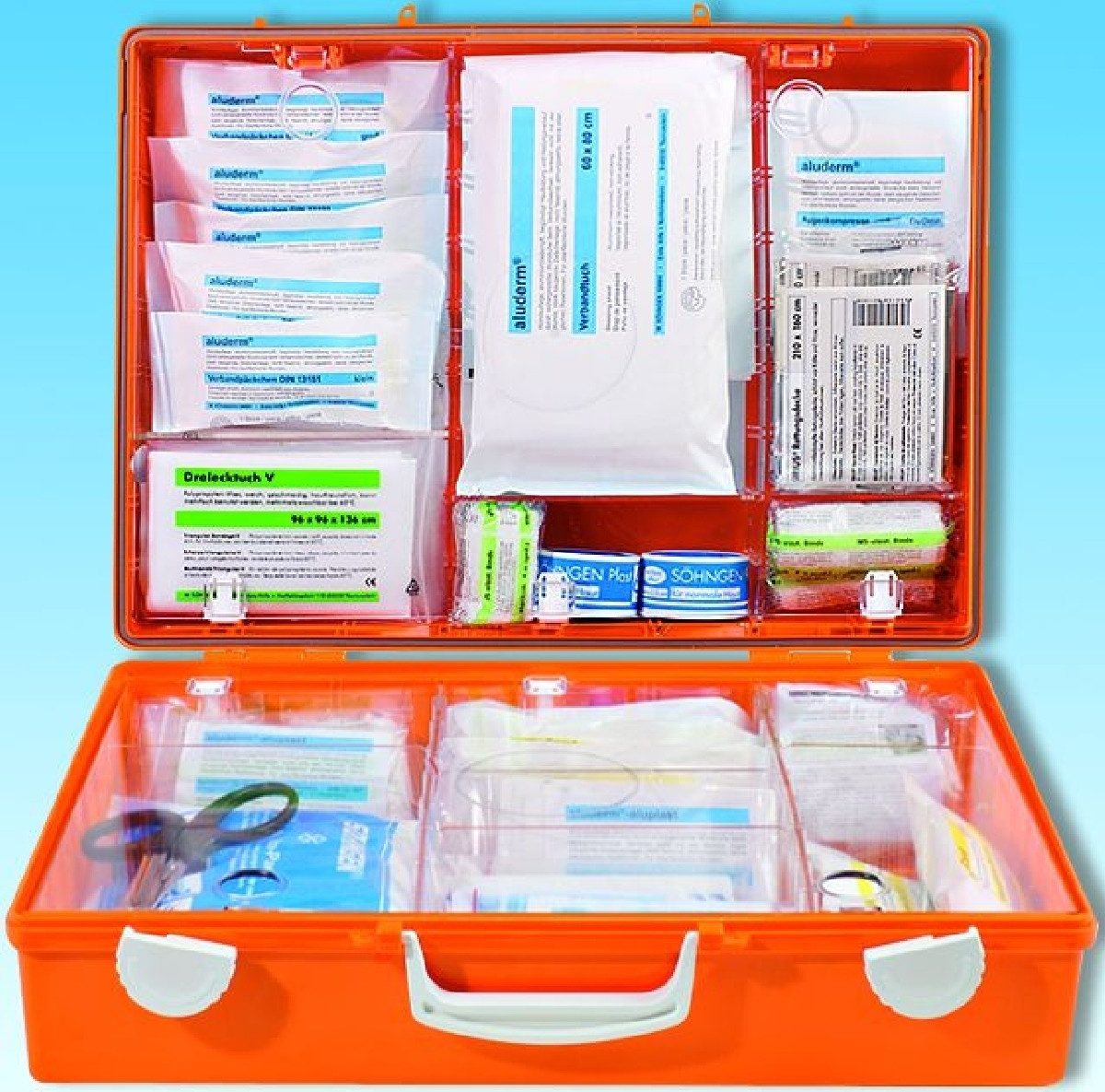 Die Erste Hilfe Koffer QUICK-CD klein und SN-CD mittel sind gemäß DIN 13157 gefüllt. Der MT-CD groß ist gemäß DIN 13169 gefüllt. Die Erste Hilfe Koffer bestehen aus zwei gleich großen Kofferschalen. Damit beim Öffnen oder Сховати der Erste Hilfe Koffer der Inhalt nicht verrutscht, ist jede Seite mit einem durchsichtigen Deckel, der sich leicht öffnen lässt verschlossen. Des Впередen werden die Erste Hilfe Koffer mit einer Wandhalterung geliefert, wodurch sie an beliebigen Orten aufgehängt werden können. In der mitgelieferten Wandhalterung können die Koffer sicher fixiert werden und bei Bedarf schnell entnommen werden. Für eine optimale Handhabung können die Koffer auch in der Wandhalterung geöffnet werden. Die Koffer bestehen aus ABS-Kunststoff und verfügen über eine Standard-Kennzeichnung mit Siebdruckbeschriftung und Farbpiktogrammen. Die sterilen Verbandstoffe von SÖHNGEN sind mit CE-Kennzeichnung, dem Herstellungsdatum und einem Haltbarkeitsdatum von 20 Jahren versehen. Des Впередen verfügen die Koffer über 5 Jahre Herstellergarantie auf bewegliche Funktionsteile (Griffe, Verschlüsse, Scharniere und Clips für Deckelplatten) sowie auf Farbgleichheit der Koffer.