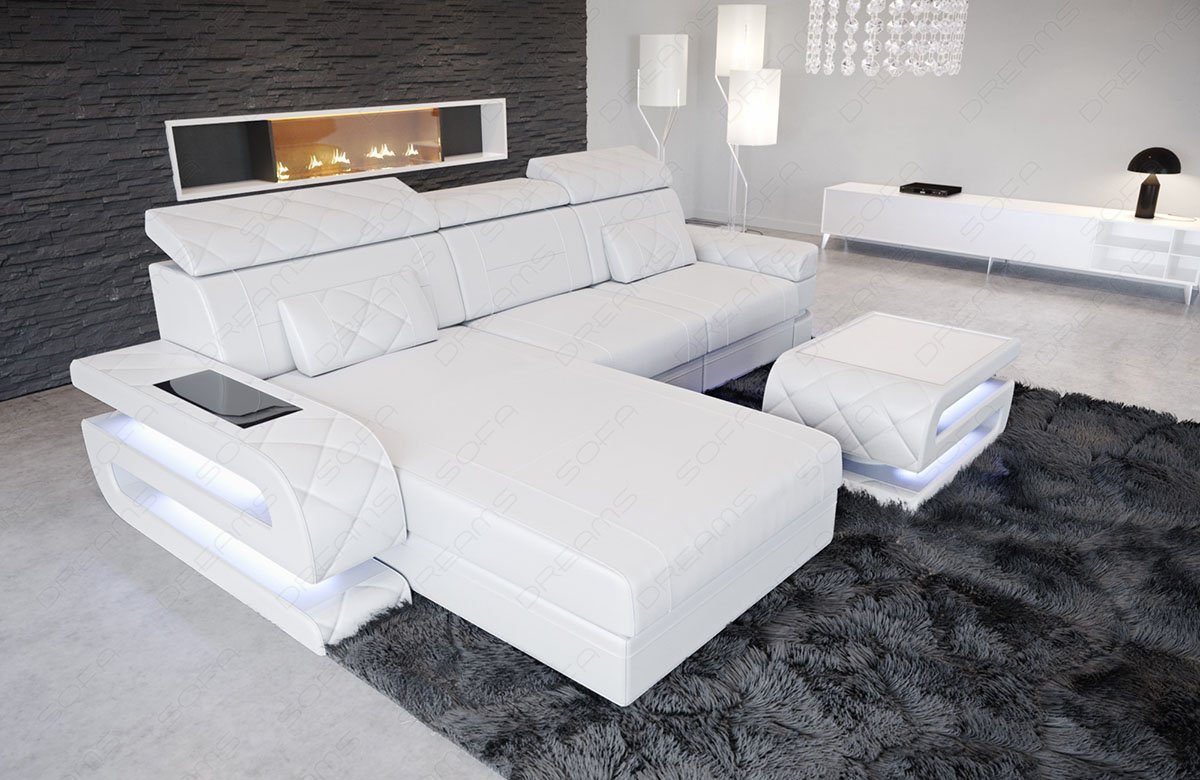 Ob im Familienhaushalt oder in der Single-Wohnung, mit dem Ledersofa Bologna sind Sie bereit für Gäste. Entspannung pur versprechen komfortable Lederbezüge, eine Bonell Federung und flexible Kopfstützen. Dabei haben Sie die Wahl. Sie erhalten das Luxussofa mit Bezügen aus Kunst- oder Echtleder oder sogar aus dickem Büffelleder, ein Material, das einen einzigartigen Sitzkomfort verspricht. Всі Варіантиn sind in unterschiedlichen Farbkombinationen erhältlich. Raffiniert ist auch die elegante Steppung in den Armlehnen, den Kissen und den Kopfstützen. Eine klappbare Armlehne mit Stauraum ist ebenfalls inklusive.