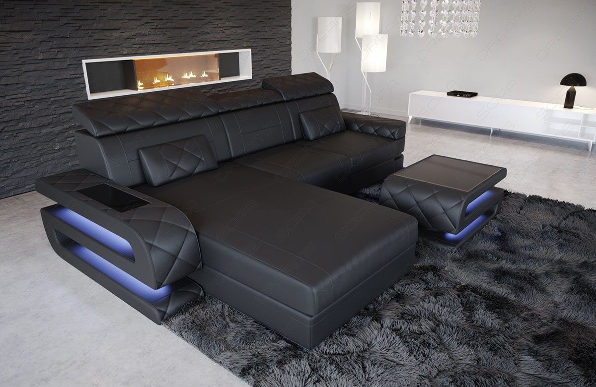 Ob in Schwarz, Grau oder Rot, beim Komfort machen wir keine Abstriche. Das Ecksofa Bologna kommt in jeder Ausführung mit LED-Beleuchtung inklusive Farbwechsel. Zusätzlich, wenn gewünscht, weist sie einen integrierten USB-Anschluss auf. Den können Sie verwenden, um elektronische Geräte aufzuladen oder auch um die mitgelieferte Leselampe zu betreiben. Hohen Sitzkomfort gewährleisten die straffe Bonell Federung und flexible Kopfstützen, im Gestell ist zusätzlicher Stauraum integriert.