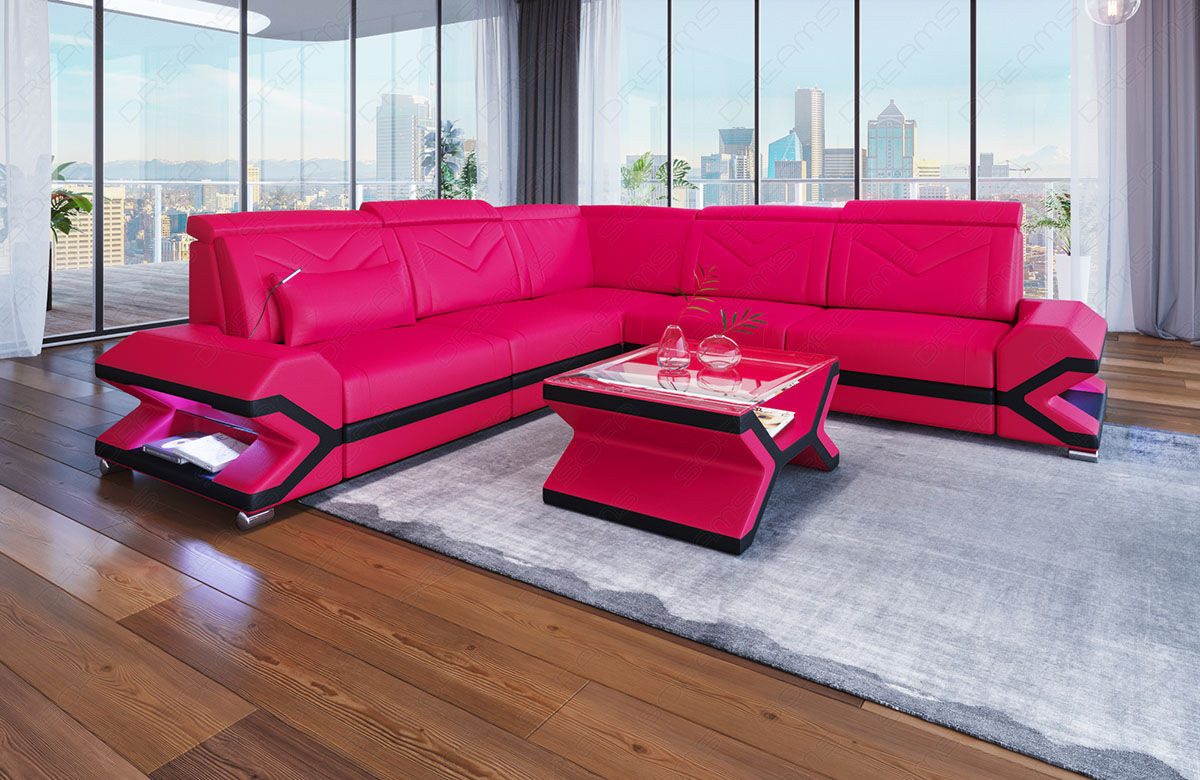 Das Ecksofa Sorrento von Sofa Dreams vereint luxuriöses Design und herausragende Funktionalität in einem modernen L-Form Sofa. Mit einer Breite von 246 cm und einer Tiefe von 60 cm bietet es großzügigen Platz und Komfort. Die verstellbaren Kopfstützen und die integrierte RGB-LED-Beleuchtung, die per Fernbedienung gesteuert werden kann, verleihen diesem Sofa eine einzigartige Atmosphäre.