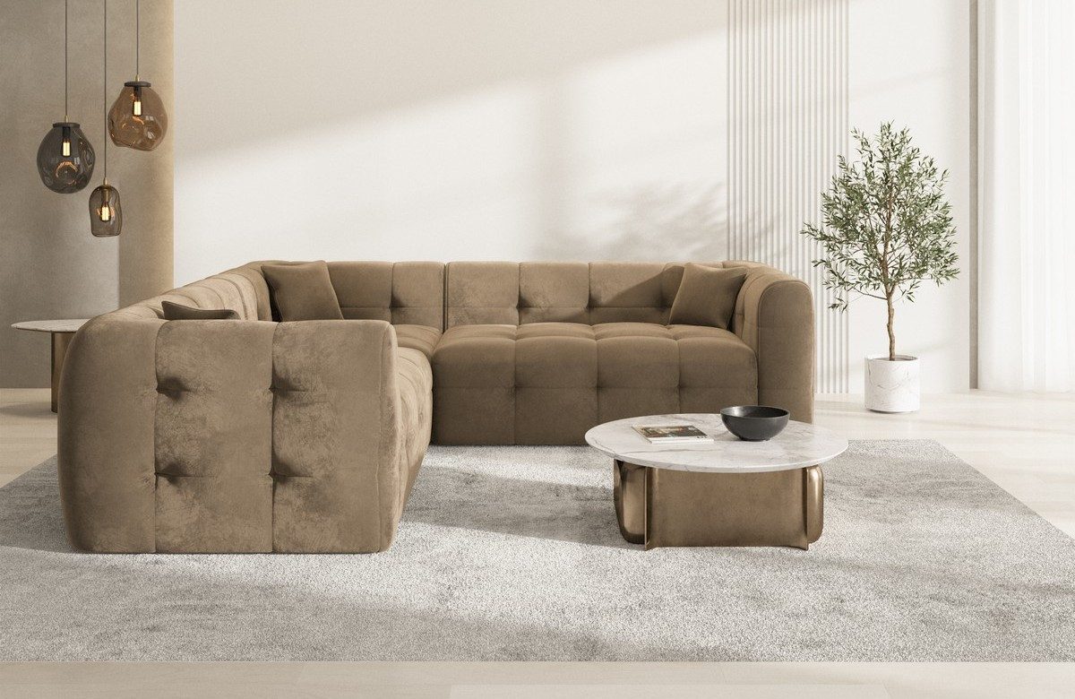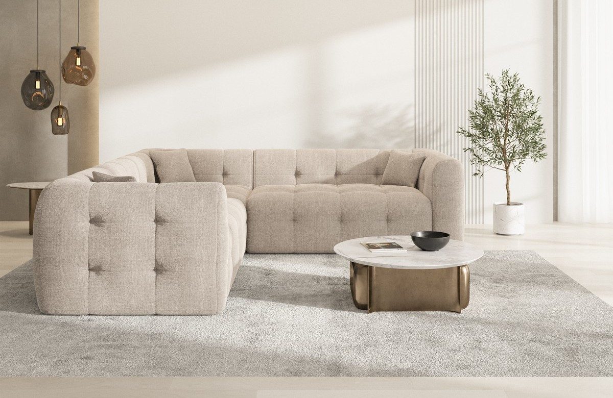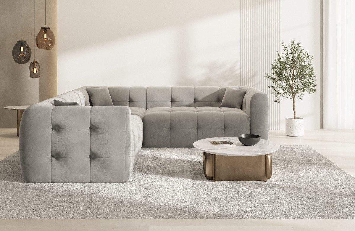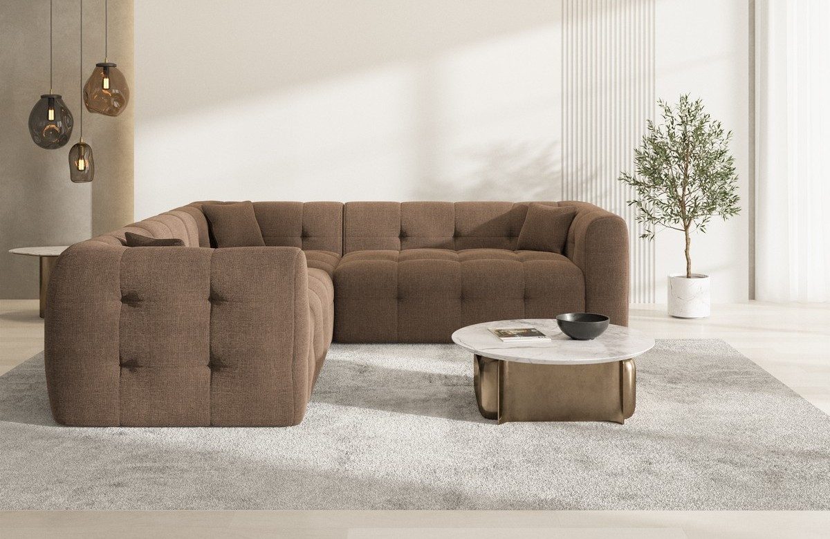 Das Sofa Sevilla L Form ist in drei hochwertigen Bezugsstoffen erhältlich, die jeweils eine besondere Atmosphäre schaffen:
