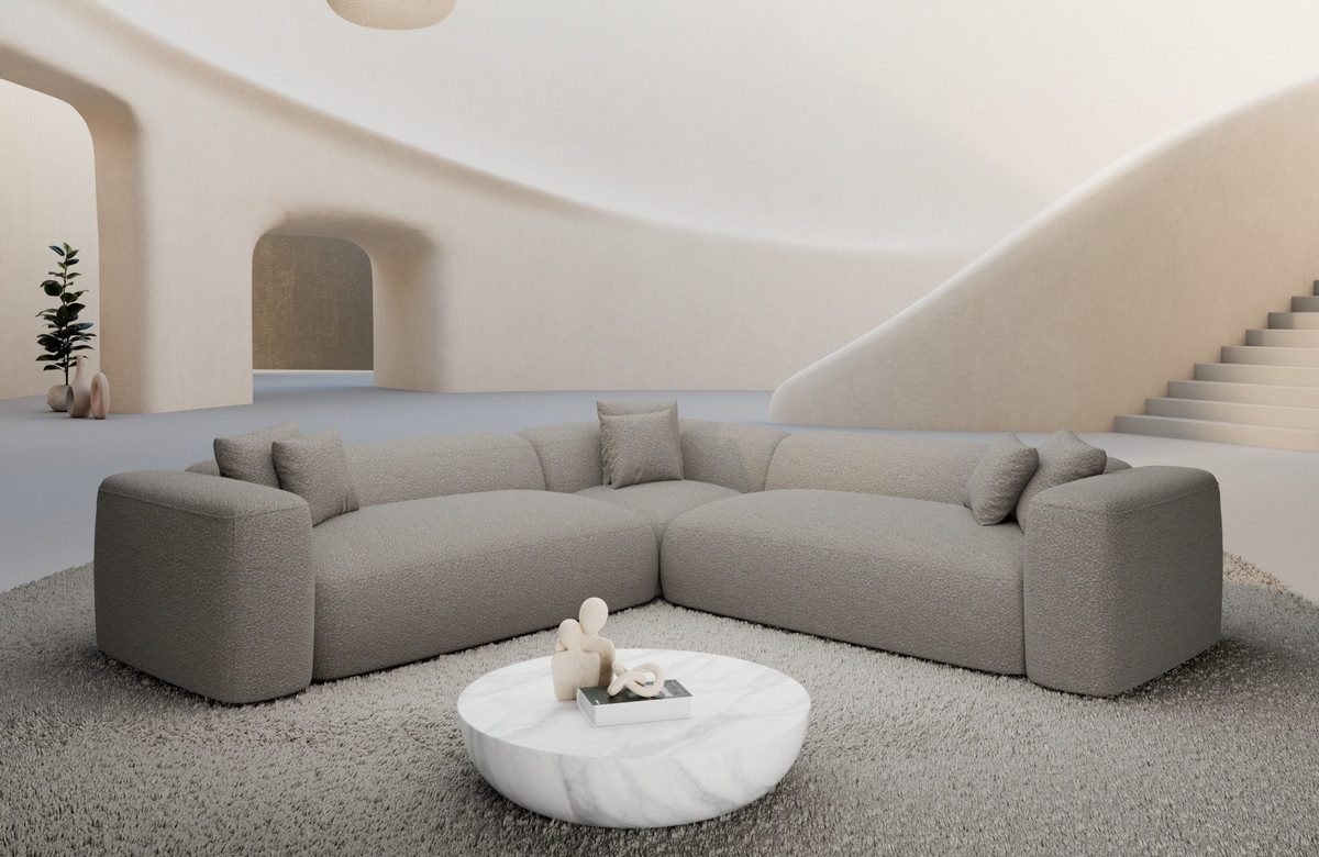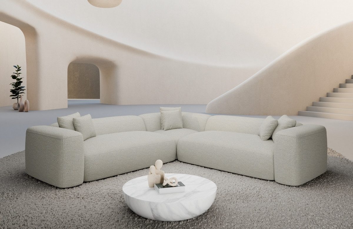 Der Boucléstoff liegt voll im Trend und begeistert durch seine unverwechselbare, unregelmäßige Oberflächenstruktur. Seine weich gewobenen Schlingen sorgen für eine kuschelige, gemütliche Haptik und ein besonderes visuelles Highlight. Bouclé wirkt einladend und verleiht dem Sofa ein modernes, skandinavisch inspiriertes Flair. Trotz seiner weichen Struktur ist der Stoff langlebig und robust, sodass er sich auch für Familien und Vielnutzer bestens eignet.