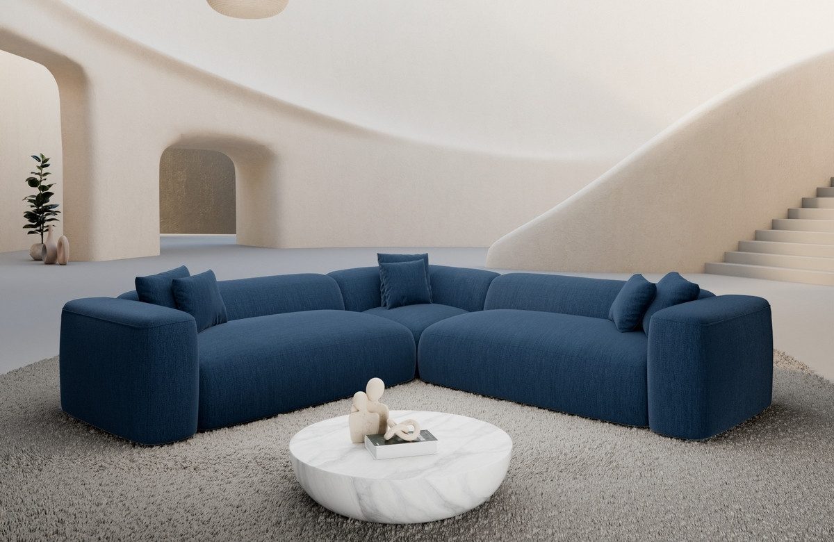 Besonders stilvoll wird das Modell durch die Auswahl an drei hochwertigen Stoffbezügen: Ein edler Strukturstoff mit griffiger Textur, ein luxuriöser, schimmernder Samtstoff, der sanft auf Licht reagiert, sowie ein trendiger Boucléstoff, der mit seiner charakteristischen Oberfläche ein modernes, wohnliches Ambiente schafft. Je nach Wunsch kann das Sofa in einer dieser stilvollen Ausführungen individuell konfiguriert werden.