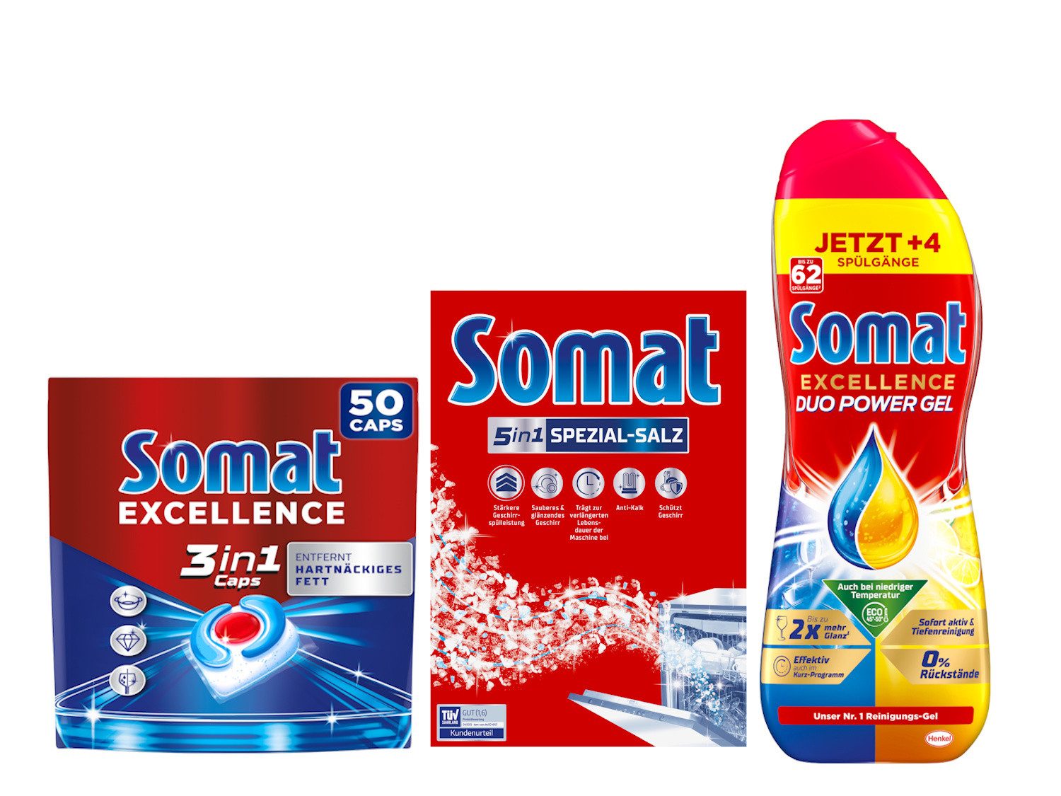 für die gründliche Reinigung des Geschirrs und die optimale Pflege der Spülmaschine. Die enthaltenen Komponenten sind perfekt aufeinander abgestimmt, um selbst hartnäckige Verschmutzungen wie Fett, Stärke und Eingebranntes zuverlässig zu entfernen. Gleichzeitig werden Kalkablagerungen wirksam vorgebeugt und unangenehme Gerüche neutralisiert. Die vielseitige Zusammenstellung eignet sich ideal für den täglichen Einsatz in allen gängigen Spülmaschinen und sorgt bei jeder Anwendung für hygienische Sauberkeit und streifenfreien Glanz. Dank effektiver Wirkstoffe werden auch bei niedrigen Temperaturen und im Kurzprogramm hervorragende Spülergebnisse erzielt. Der frische Duft sorgt zusätzlich für ein angenehmes Reinigungserlebnis. Ob für den Einzelhaushalt oder die Großfamilie – SOMAT Bundles sind in verschiedenen Größen und Варіантиn erhältlich und bieten eine zuverlässige Komplettlösung für gepflegtes Geschirr und eine langfristig geschützte Maschine. Die Kombination aus Reinigungskraft und Maschinenpflege macht dieses Set zur idealen Wahl für alle, die Wert auf Effizienz, Qualität und Komfort im Haushalt legen. Mit einem Bundle von SOMAT entscheidet man sich für bewährte Markenqualität, auf die man sich bei jedem Spülgang verlassen kann – für Sauberkeit, Glanz und Frische in einem Paket.