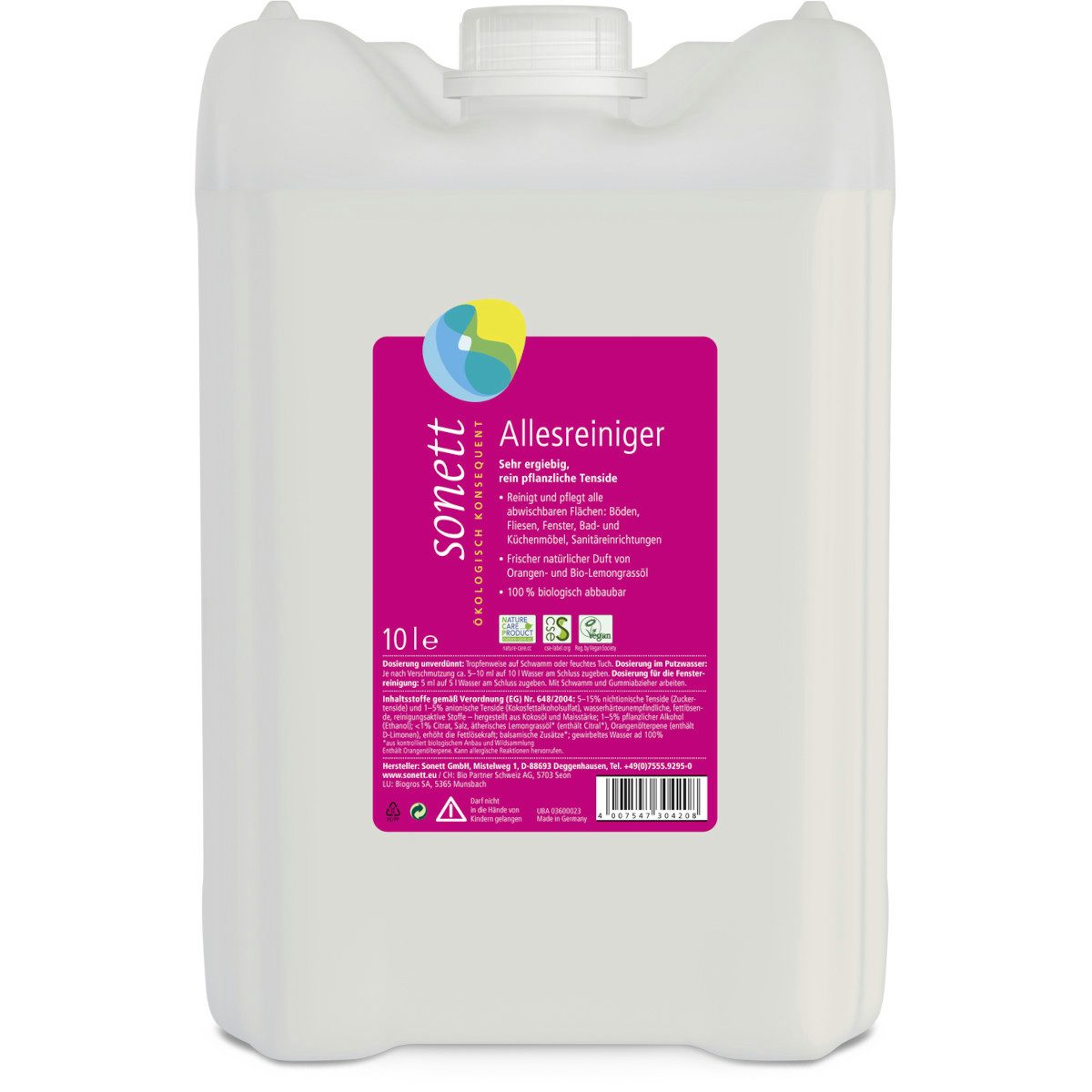 Die verwendeten waschaktiven Stoffe weisen in ihrer Kombination eine ausgesprochen gute Hautverträglichkeit auf. Der Sonett Всіsreiniger ist, wie alle unsere Produkte, hochkonzentriert und daher sehr ergiebig.
