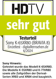 Der Sony K-65XR80 erzielt im Einzeltest des Magazins „HDTV“ das Gesamtergebnis „sehr gut“. Der 65-Zoll-Bildschirm bietet kräftige Kontraste, tiefes Schwarz und natürliche Farben. Die Ausstattung überzeugt u. a. mit diversen Anschlüssen, Gaming- und Tuner-Funktionen sowie Streaming-Apps. Außerdem ist die Soundwiedergabe stark. Insgesamt bietet der OLED-TV ein „gutes“ Preis-Leistungs-Verhältnis und ist ein „HEIMKINO-TIPP“ sowie ein „GAMING-TIPP“.