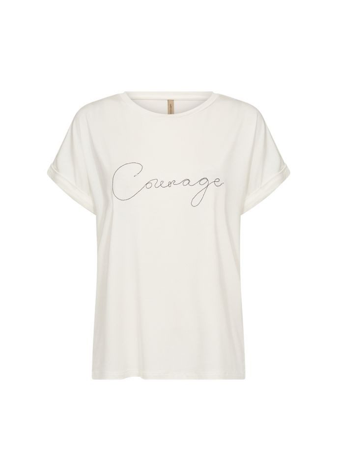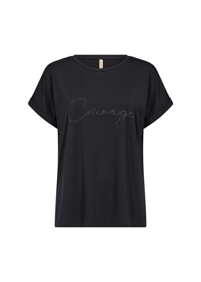 Das SC‑MARICA 336 von Soyaconcept ist ein modernes T‑Shirt aus hochwertigem Lyocell-Elastan-Mix – federleicht, angenehm weich und mit einem symbolträchtigen „Courage“-Print versehen.