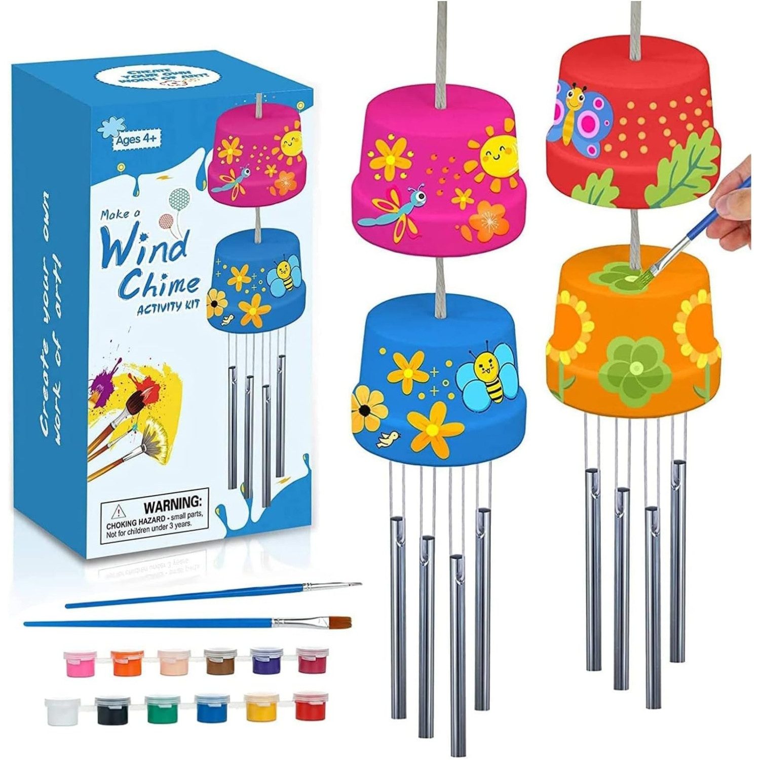 Machen Sie ein Windspiel 2er-Pack Bastelsets für Kinder, Jungen und Mädchen, Spielzeug zum Selbermachen, Bauen und Bemalen von Musikglockenspiel Geschenk aus Holz. Das Windspiel-Set kombiniert die Wissenschaft der Windkraft mit Kunst- und Handwerksmaterialien, um ein Paar schöne Terrakotta-Blumentopf-Windspiele zu kreieren und zu personalisieren, was es zu einer tollen Ergänzung für jede Veranda oder Hinterhof macht. Der Lieferumfang enthält zwei Sets von Make-a-Chime-Materialien, jeweils bestehend aus einem Paar Terrakotta-Töpfen, 4 Klangstäben, 1 dicke Schnur für Töpfe, 1 dünne Schnur zusammen mit 1 Nabentafel für Klangstäbe. Zusätzlich sind 12 Farben in verschiedenen Farben und 2 Pinsel enthalten.