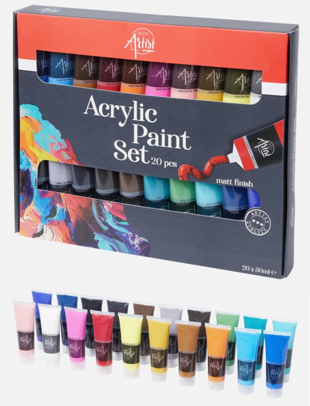 Acrylfarbenset 20 x 30 ml • Acrylfarbe in Grundfarben • Für alle deine Kunstwerke Diese Farbe ist ideal zum Experimentieren. Verwende sie zum Beispiel auf Holz, Papier oder einem Tuch. So kannst du deiner Kreativität völlig freien Lauf lassen. • Acrylfarben-Set enthält 20 lebendige Farben: Dieses Set kommt mit 20 leuchtenden Farben in einer Tube mit 30 ml Tube mit einem praktischen Klappverschluss • Tolle Lichtechtheit und Glanz-Finish: Diese Acrylfarben gleiten sanft auf Leinwand, Papier, Holz, Keramik usw. und trocknen schnell zu einem glänzenden Finish • Hochwertige Pigmente: Die cremige Konsistenz und hohe Pigmente bieten eine große Deckkraft für große Flächen und feine Details. Entspricht ASTM D-4236 und EN71. Säurefrei, ungiftig und geeignet, sicher für Kinder • Tolle Mischbarkeit: Die Klarheit und Brillanz ermöglichen eine hervorragende Farbmischung, um eine umfangreiche Farbpalette an Schattierungen und Tönen zu bieten • Vielseitig für die meisten Kunst- und Kunsttechniken und geeignet für die meisten Maloberflächen einschließlich Leinwand, Papier, Holz, Stoff, Leder, Pappe, MDF und Handwerk • Perfektes Geschenk: Ein tolles Geschenk für Malliebhaber. Eine gute Wahl für Anfänger und auch für Profis. Acrylfarben sind vielseitig in Weihnachtsdekorationen, Innen- und Außendekorationen, ein ideales Geschenk für Geburtstag, Weihnachten, Thanksgiving und mehr