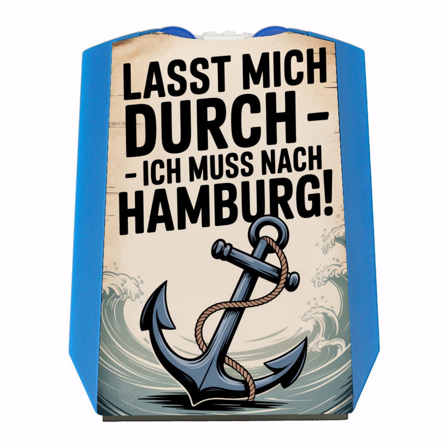 Die Anker Hamburg Parkscheibe besticht durch ein charmantes Vintage-Motiv. Der witzige Spruch 'Lasst mich durch - Ich muss nach Hamburg!' in einer retro Serifenschrift sorgt für maritime Stimmung. Ein kunstvoller Anker in Blau und Weiß verschönert das Design, das an verwittertes Holz erinnert und die Sehnsucht nach Hamburg weckt.
