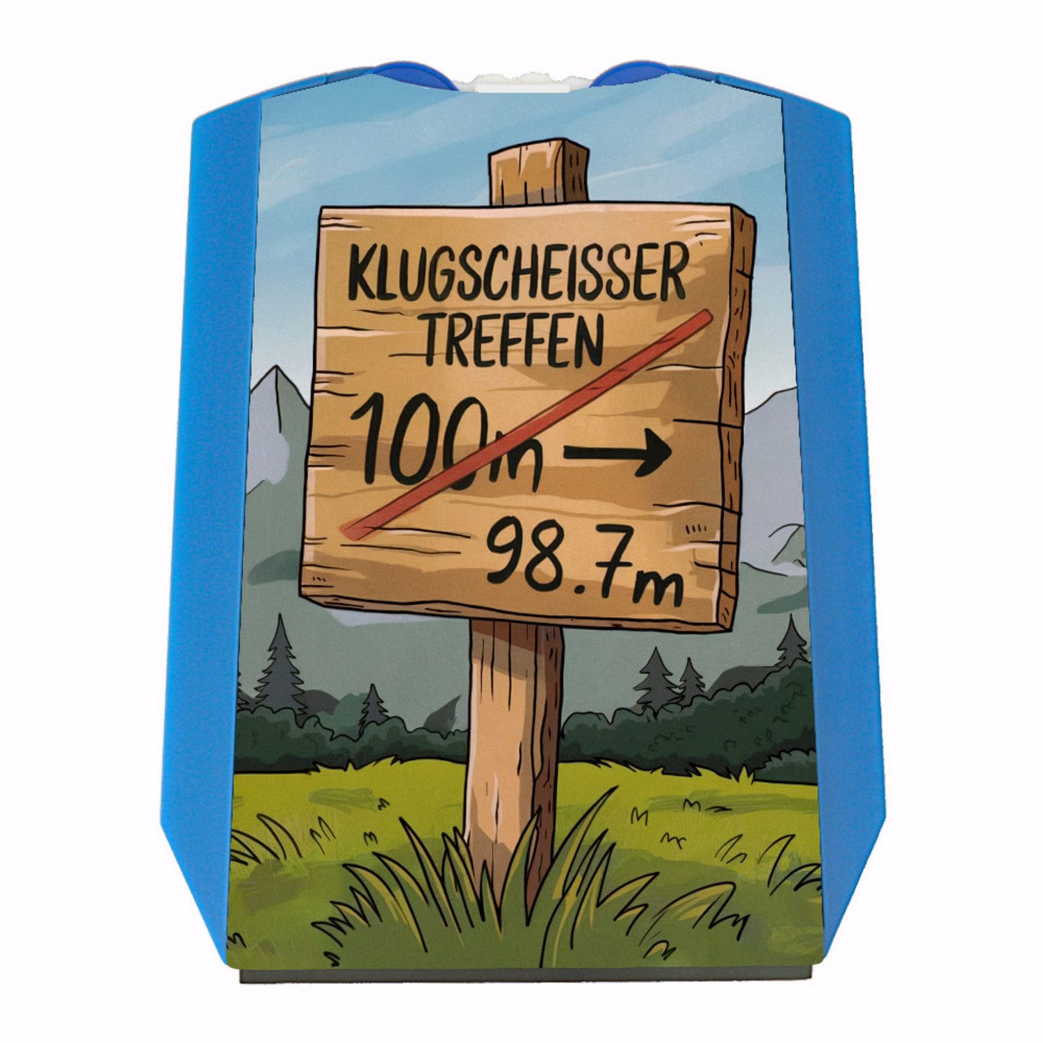 Klugscheisser Treffen Parkscheibe: Ein witziges Must-Have für alle Autofahrer! Die humorvolle Illustration zeigt ein Holzschild im Gras, auf dem 'Klugscheisser Treffen' steht. Ein durchgestrichenes 100m und handschriftlich korrigiertes 98.7m sorgen für Lacher!