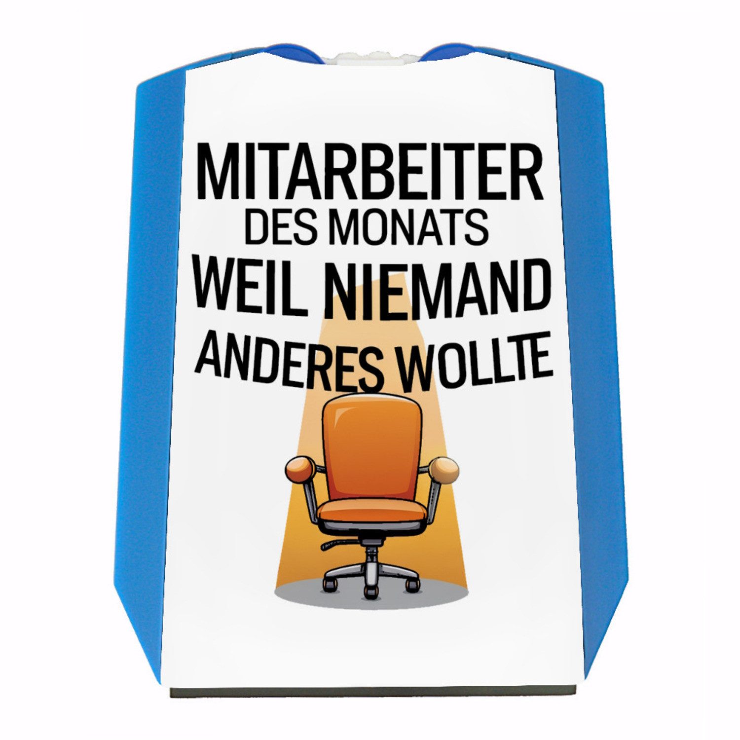 Unsere witzige Parkscheibe zeigt einen leeren Bürostuhl in knalligem Orange, über den prangt stolz 'MITARBEITER DES MONATS'. Darunter steht, humorvoll: 'WEIL NIEMAND ANDERES WOLLTE'. Ein lustiges Cartoon-Design mit buntem Spotlight und Arbeiter-Medaille macht diese Parkscheibe zum echten Hingucker.