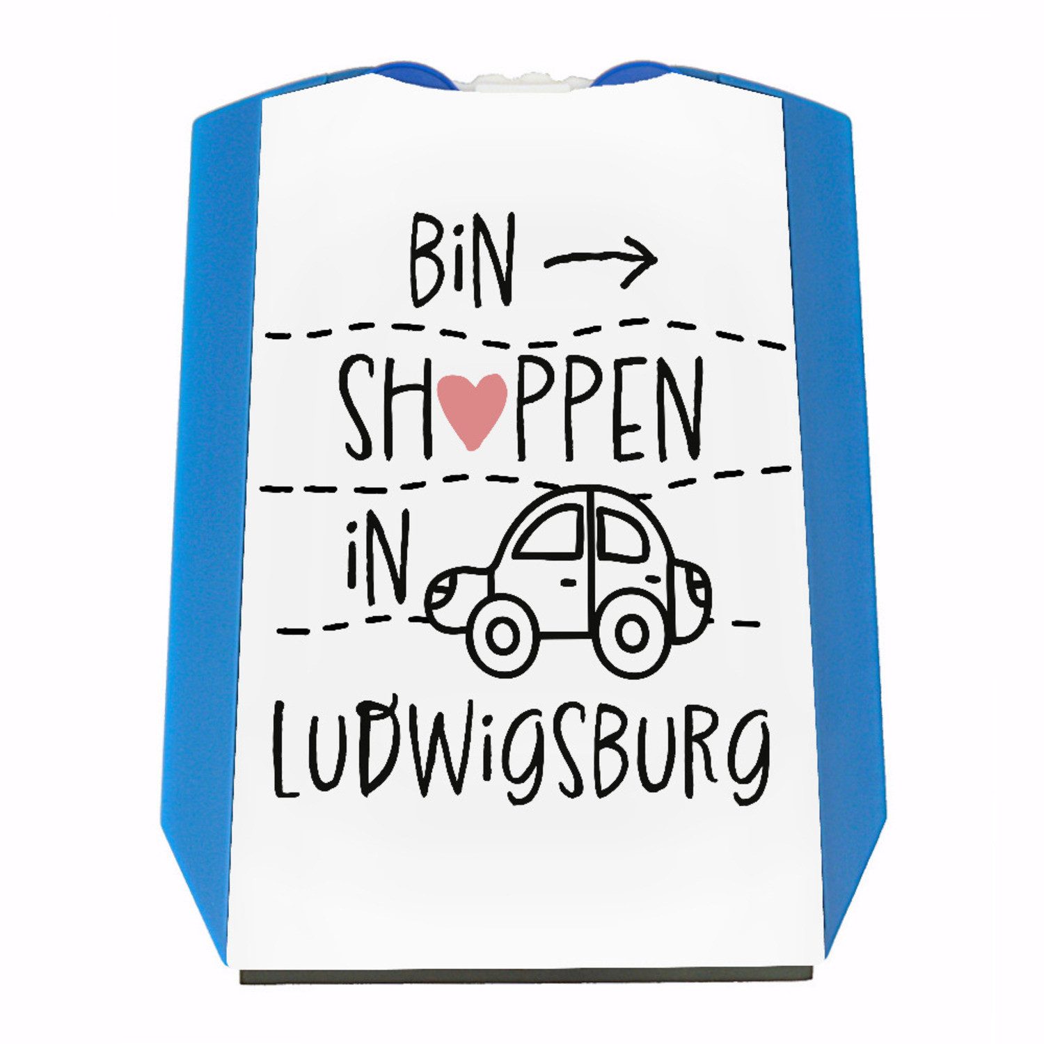 • Parkscheibe mit verspieltem Motiv: Auf weißem Hintergrund steht BIN SHOPPEN in LUDWIGSBURG. Ein Auto mit Herzsymbol sorgt für humorvolle Note. Klare Linien betonen.