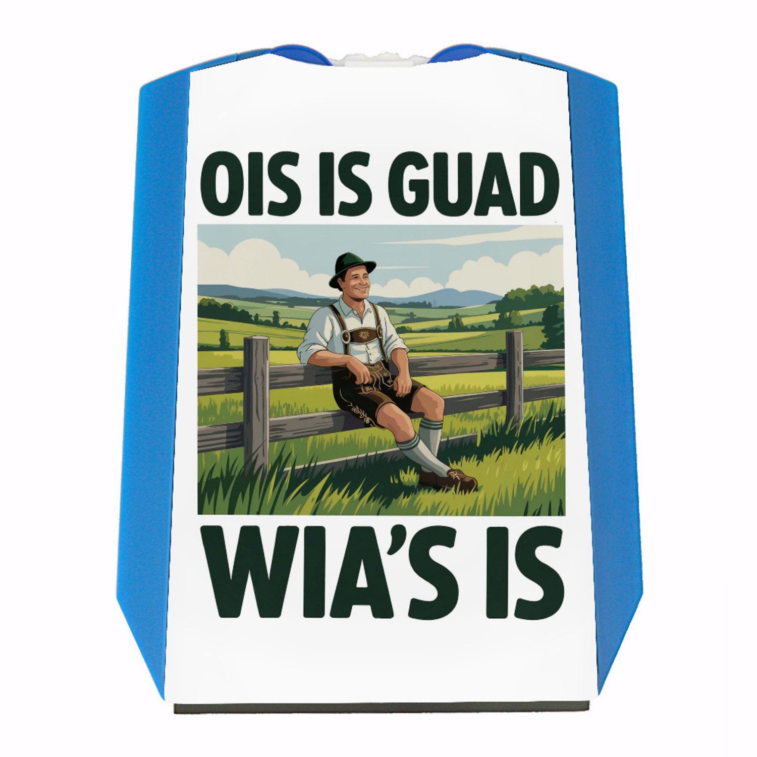 • Parkscheibe im charmanten Design: Ein lächelnder Bauer in bayerischer Tracht lehnt am Holzzaun, blickt auf Felder. Mit Spruch Ois is guad, wia's is.