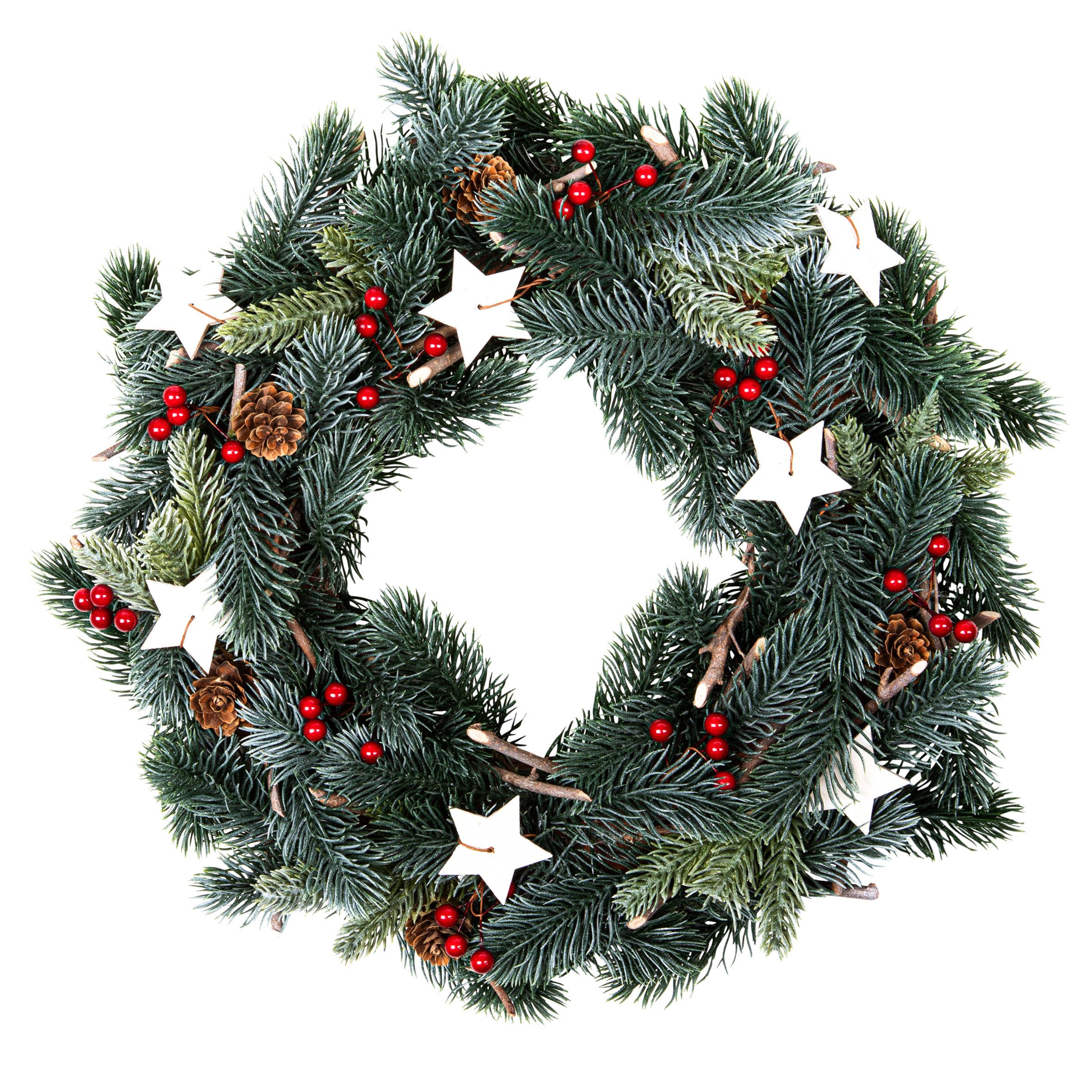 künstlicher Tannenkranz mit Beeren Tannenzapfen und Holz Sternen