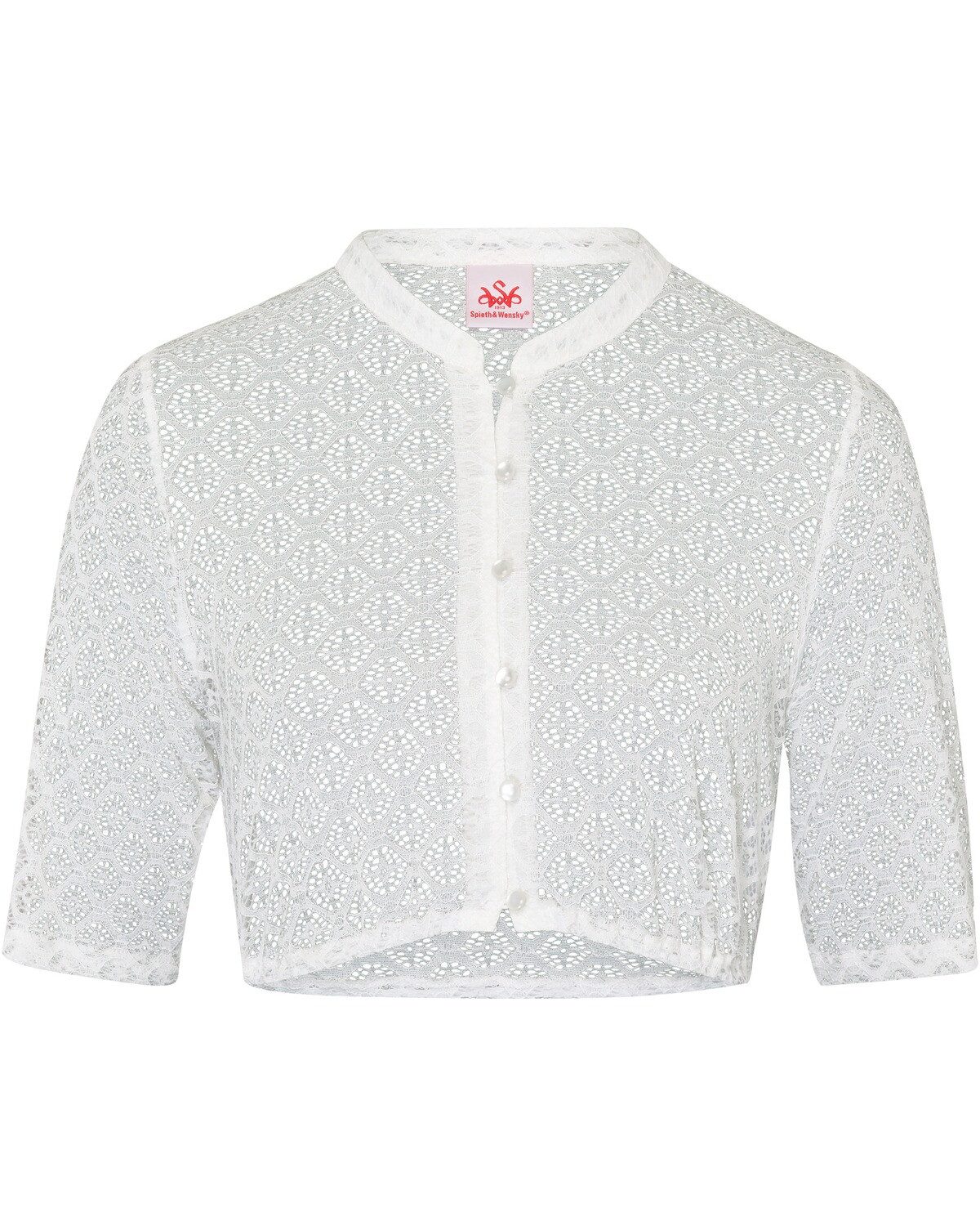 Tradition trifft Moderne Die Dirndlbluse Efsana von Spieth & Wensky zeigt, wie harmonisch sich traditionelle und moderne Elemente verbinden lassen. Komplett aus weicher Spitze gefertigt, strahlt sie eine dezente Eleganz aus, die durch den kurzen Stehkragen und die glänzenden Knöpfe zusätzlich betont wird. Diese Details verleihen der Bluse eine raffinierte Note, die den klassischen Trachtenstil auf zeitgemäße Weise interpretiert. Luftige Leichtigkeit und zeitlose Eleganz Mit ihren halblangen Ärmeln bringt die Bluse eine gewisse Leichtigkeit ins Spiel, die das geschmackvolle Gesamtbild abrundet. Diese facettenreiche Kombination aus traditionellem Charme und modernem Design macht die Dirndlbluse Efsana zu einem vielseitigen Begleiter für festliche Anlässe und traditionelle Feierlichkeiten. Sie hebt jedes Dirndl-Outfit auf stilvolle und zeitgemäße Weise hervor. Oberstoff: 90% Polyester, 10% Elasthan